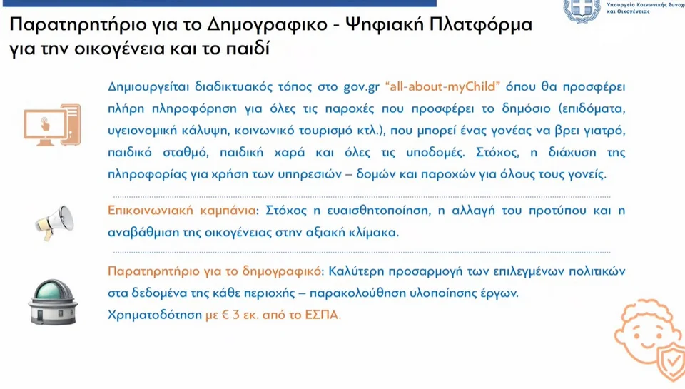 Τα μέτρα έχουν στόχο την ενίσχυση και ελάφρυνση των οικογενειών και συγκεκριμένα για το δημογραφικό ζήτημα, την αναμόρφωση των κοινωνικών επιδομάτων και τη στήριξη των εργαζόμενων γονιών μέσω της καλύτερης σύζευξης της επαγγελματικής με την οικογενειακή ζωή.