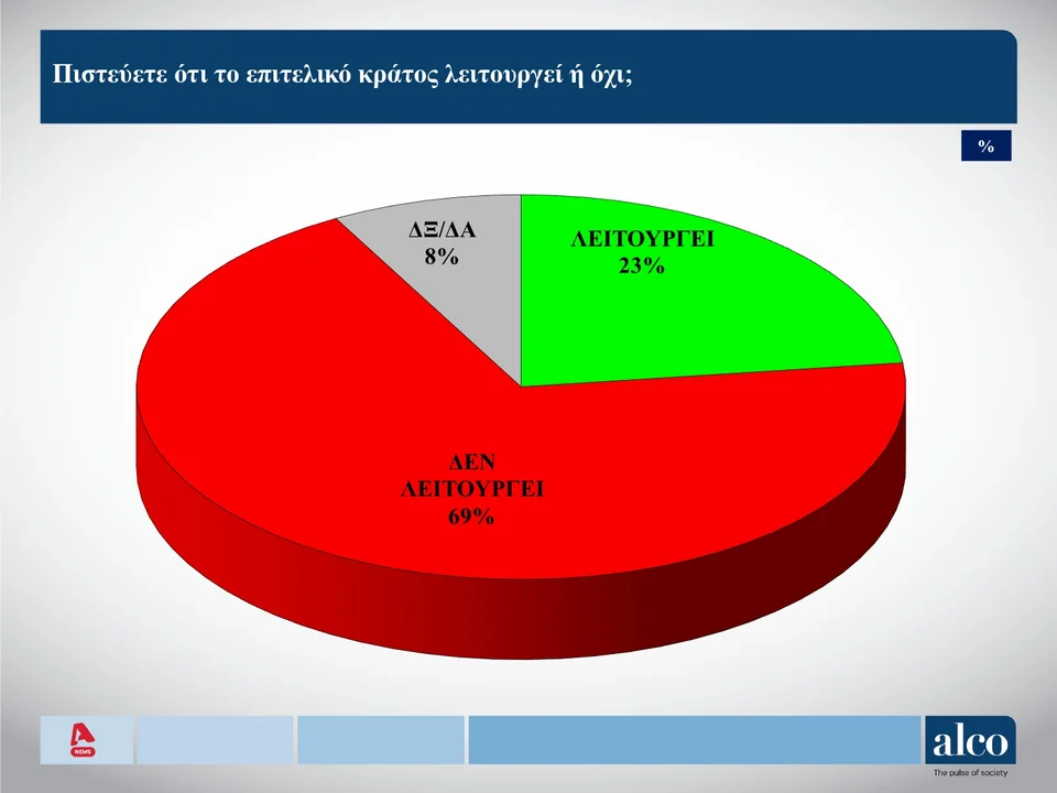 Σχεδόν 7 στους 10 (ποσοστό 69%) πιστεύουν ότι δεν λειτουργεί το επιτελικό κράτος. Στον αντίποδα, το 23% θεωρεί ότι λειτουργεί.
