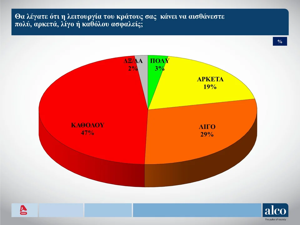 Οι πολίτες σε ποσοστό 47% δεν αισθάνονται «καθόλου ασφαλείς» από τη λειτουργία του κράτους. Το 29% απαντά «λίγο», «αρκετά» λέει το 19%, «πολύ» μόλις το 3%.