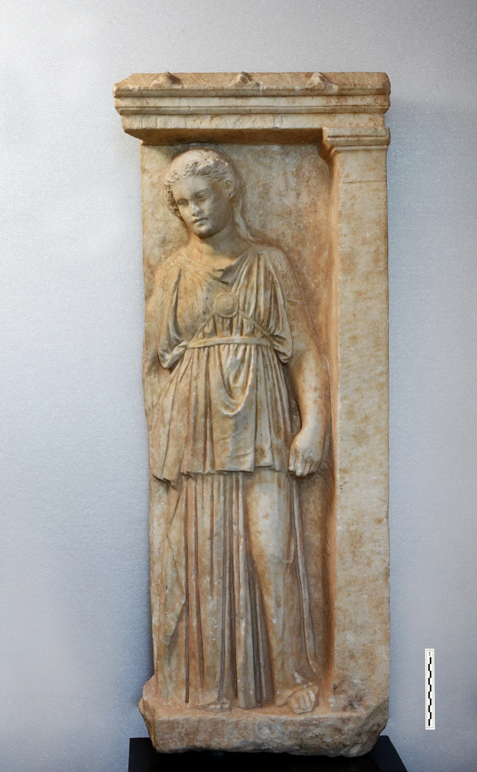 2. Τμήμα αττικού επιτύμβιου ναΐσκου από πεντελικό μάρμαρο, ύψους 0,95μ. και πλάτους 0,42μ. με ανάγλυφη παράσταση. Στο επιστύλιο σώζονται γράμματα νεότερης επιγραφής, που οφείλονται στην επαναχρησιμοποίηση του μνημείου σε μεταγενέστερη της κατασκευής του εποχή. Εικονίζεται νεαρό κορίτσι που παριστάνεται όρθιο, κατενώπιον με την κεφαλή να κλίνει ελαφρώς στα δεξιά. Φορεί χιτώνα με μανίκια και αττικό πέπλο ζωσμένο κάτω από το στήθος. Το ένδυμα συγκρατούν μασχαλιστήρες που διασταυρώνονται χιαστί μπροστά στο στήθος και στο μέσο ενώνονται με κυκλικό μετάλλιο. Χρονολογείται γύρω στα 330-320 π.Χ.