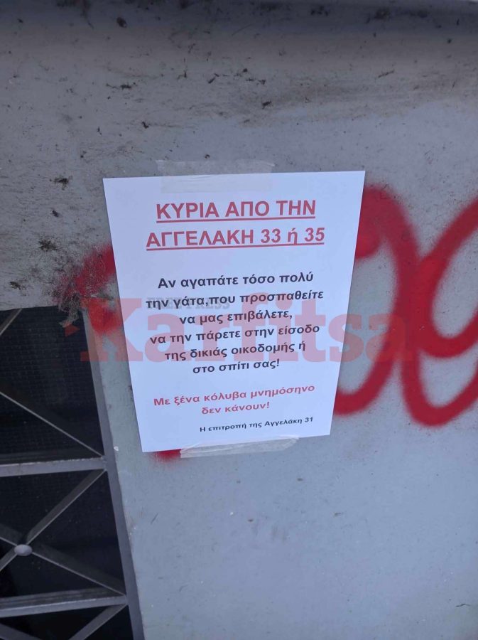Σε προειδοποιητικό σημείωμα που είναι αναρτημένο στην είσοδο πολυκατοικίας αναγράφεται ότι μια κυρία από άλλο κτήριο έχει «επιβάλει» η γάτα που φροντίζει να βρίσκεται στην είσοδο των γειτόνων.