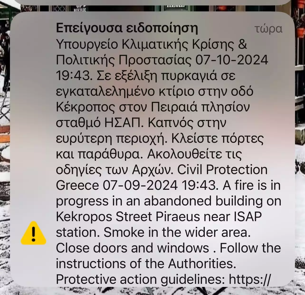 Μάλιστα λόγω του μαύρου καπνού που έχει σκεπάσει τον Πειραιά από την μεγάλη φωτιά στο κτίριο έχει σημάνει 112 και ζητά από τον κόσμο να κλείσει πόρτες και παράθυρα και να ακολουθεί τις οδηγίες των Αρχών.