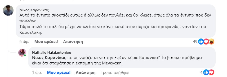 Η απάντηση ήρθε από τη Ναταλί Χατζηαντωνίου, δημοσιογράφο της Εφημερίδας των Συντακτών η οποία έγραψε: «Ποιος νοιάζεται για την ΕΦΣΥΝ κ. Καρανίκα; Το βασικό πρόβλημα είναι ότι σταμάτησε η εκπομπή της Μενεγάκη».