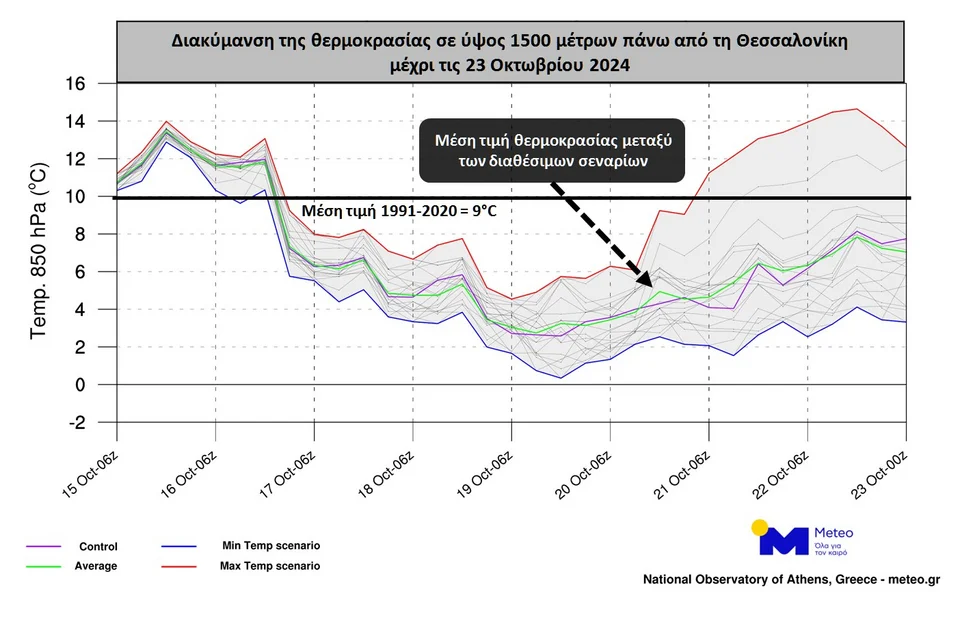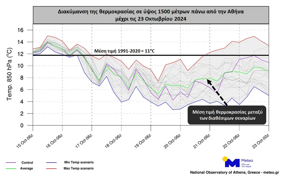 Στα παρακάτω διαγράμματα του Meteo.gr που ακολουθούν παρουσιάζεται, ενδεικτικά, το εύρος διακύμανσης της θερμοκρασίας έως τις 23/10 σε ύψος περίπου 1.500 μέτρων επάνω από την Αθήνα και τη Θεσσαλονίκη.