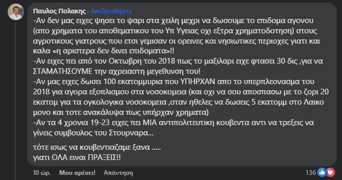 –Αν δεν μας ειχες ψησει το ψαρι στα χειλη μεχρι να δωσουμε το επιδομα αγονου (απο χρηματα του αποθεματικου του Υπ Υγειας οχι εξτρα χρηματοδοτηση) στους αγροτικους γιατρους που ετσι γεμισαν οι ορεινες και νησιωτικες περιοχες γιατι και καλα «η αριστερα δεν δινει επιδοματα»!!