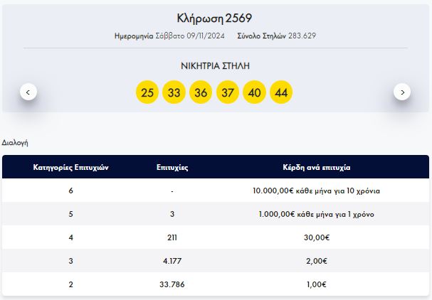 Στην κλήρωση ΛΟΤΤΟ αριθμός 2569, σήμερα Σάββατο 09/11/2024 οι τυχεροί αριθμοί είναι 33, 25, 37, 40, 36, 44.