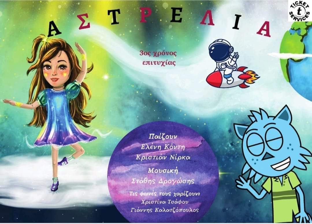 Μια διαδραστική παράσταση με χορό, μουσική, διαγαλαξιακές λέξεις και τον Αστέριο: τον φίλο της Αστρέλια από τον πλανήτη Κέπλερ22b, χαρακτήρας animation, που εμφανίζεται σε προβολή και αλληλοεπιδρά σε ζωντανό χρόνο με το κοινό και την παράσταση.