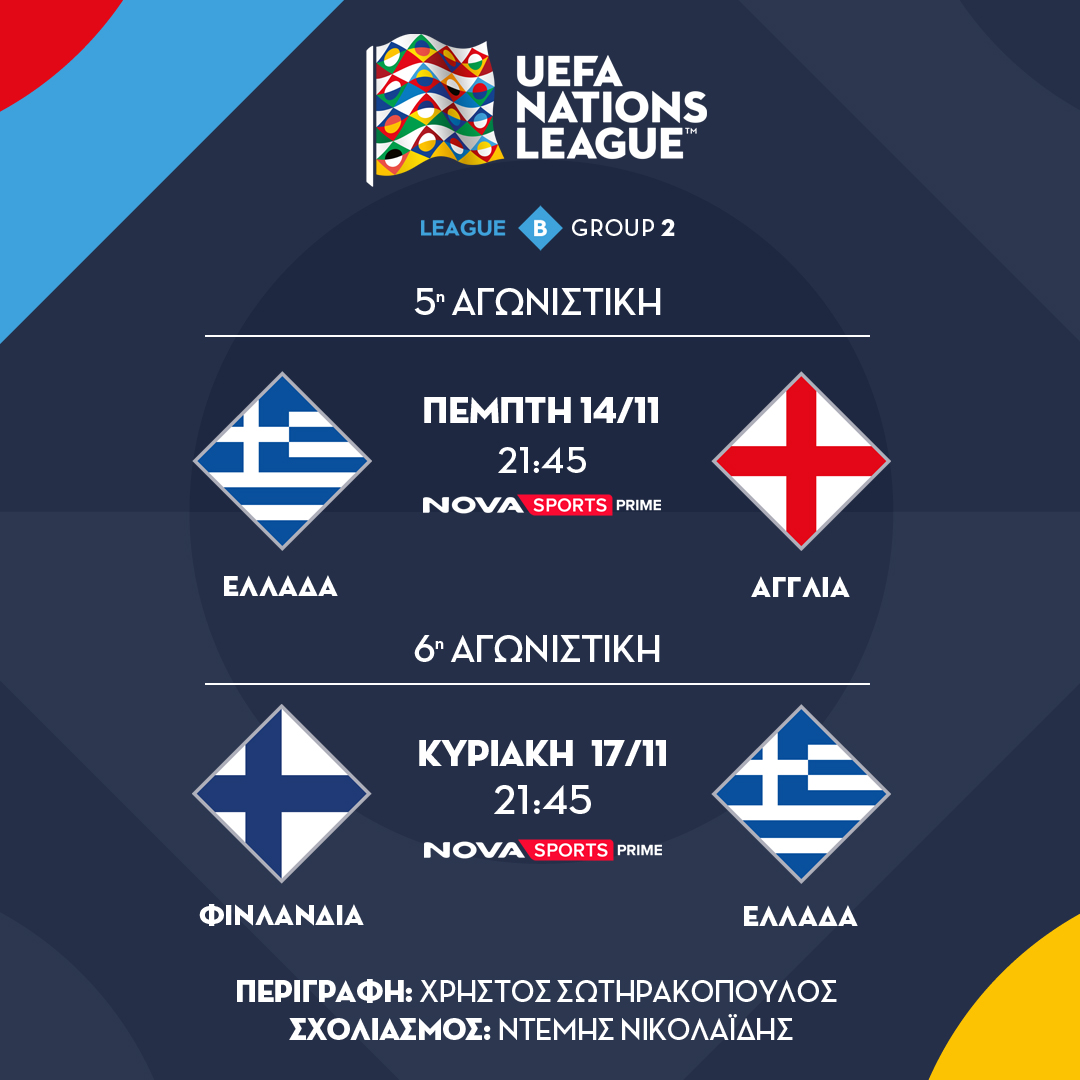 Στο UEFA Nations League η Εθνική μας ομάδα με τον Ιβάν Γιοβάνοβιτς πάγκο μετά το 4Χ4 στις τέσσερις πρώτες αγωνιστικές υποδέχεται στο ΟΑΚΑ την Αγγλία (14/11, 21:45) και αντιμετωπίζει εκτός έδρας την Φινλανδία (17/11, 19:00) με στόχο να συνεχίσει τα θετικά αποτελέσματα, κατακτώντας την πρώτη θέση και την άνοδο στη League A που οδηγεί στους τελικούς και στην ελπίδα για εισιτήριο στο Μουντιάλ του 2026. Οι αγώνες της «γαλανόλευκης» θα μεταδοθούν στο Novasports Prime σε περιγραφή του Χρήστου Σωτηρακόπουλου και σχόλιο του Ντέμη Νικολαΐδη.