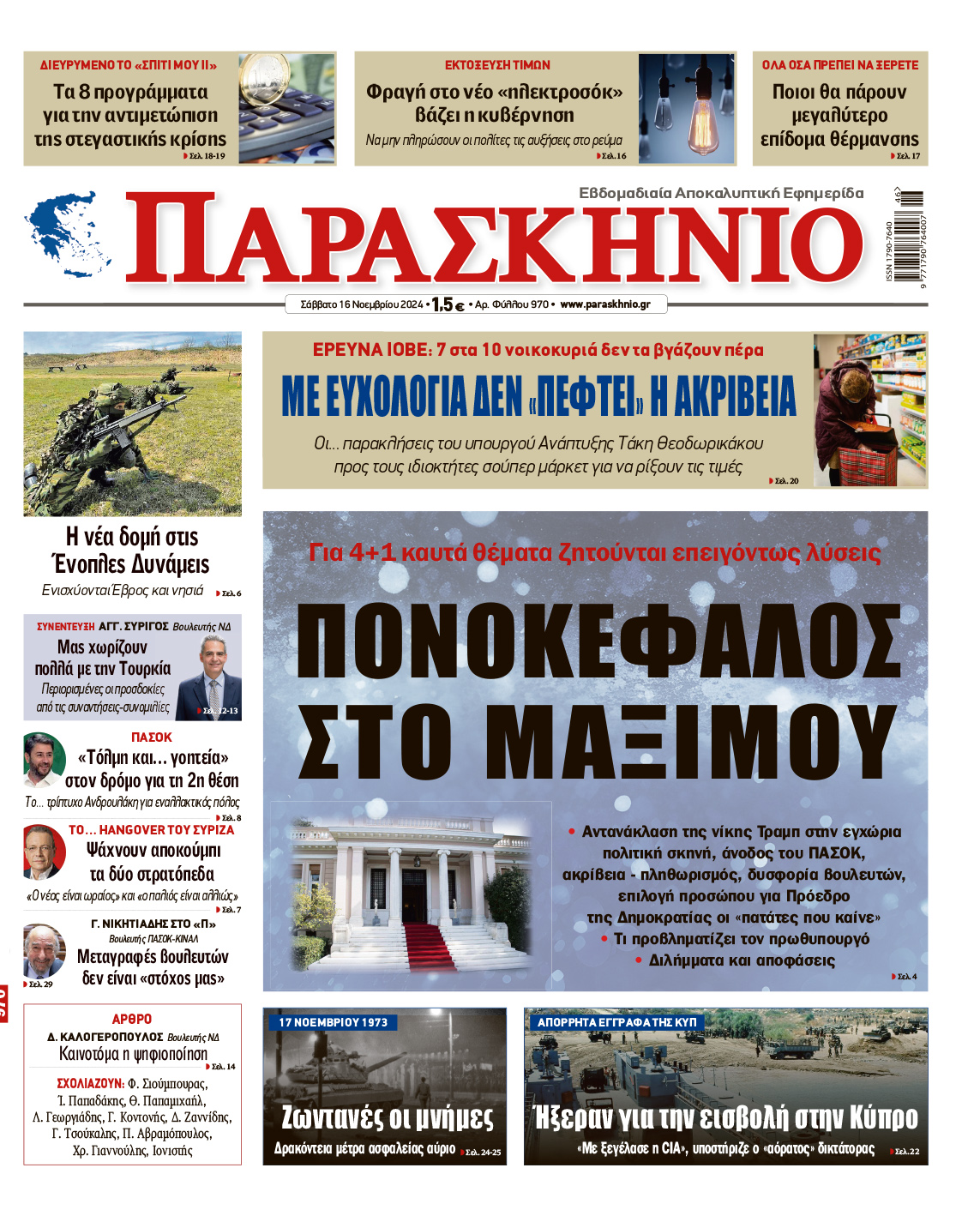 • Αντανάκλαση της νίκης Τραμπ στην εγχώρια πολιτική σκηνή, άνοδος του ΠΑΣΟΚ, ακρίβεια – πληθωρισμός, δυσφορία βουλευτών, επιλογή προσώπου για Πρόεδρο της Δημοκρατίας οι «πατάτες που καίνε»