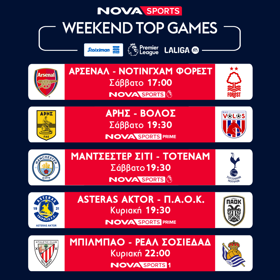 Στην Premier League, το κορυφαίο πρωτάθλημα στον κόσμο με τους 380 αγώνες LIVE και με τη φωνή του Χρήστου Σωτηρακόπουλου,, ξεχωρίζει στα κανάλια Novasports, το ντέρμπι Μάντσεστερ Σίτι – Τότεναμ (23/11, 19:30) καθώς και οι αγώνες Άρσεναλ-Νότιγχαμ Φόρεστ (23/11, 17:00), Σαουθάμπτον-Λίβερπουλ (24/11, 16:00) και Ίπσουιτς-Μάντσεστερ Γιουνάιτεντ (24/11, 18:30). Η Premier League θα πλαισιωθεί με τις εκπομπές «Premier League Kick Off» και «Premier League The Show» με τον Άγγελο Στυλιάδη.