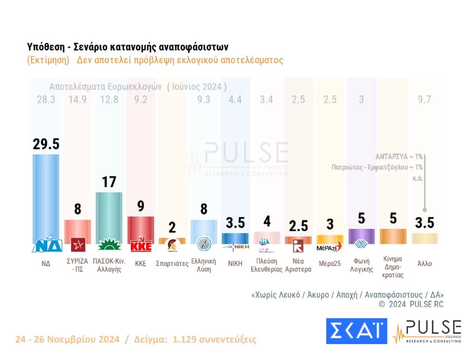 Στην πρόθεση ψήφου, η Νέα Δημοκρατία καταγράφει 24%, το ΠΑΣΟΚ 14%, το ΚΚΕ 7,5%, ο ΣΥΡΙΖΑ 6,5%, η Ελληνική Λύση 6,5%, η Φωνή Λογικής 4%, η Πλεύση Ελευθερίας 3,5%, η Νίκη 3%, το ΜέΡΑ25 2,5%, η Νέα Αριστερά 2% και οι Σπαρτιάτες 1,5%.