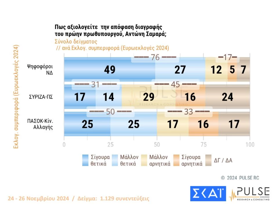 Σε ερώτημα σχετικά με το πώς κρίνουν οι ψηφοφόροι την απόφαση του Κυριάκου Μητσοτάκη για διαγραφή του πρώην πρωθυπουργού Αντώνη Σαμαρά από τη Νέα Δημοκρατία, στο σύνολο των ερωτηθέντων το 42% απαντά σίγουρα ή μάλλον θετικά και το 35% σίγουρα ή μάλλον αρνητικά.