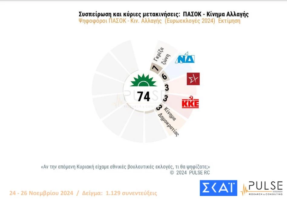 Το ΠΑΣΟΚ καταγράφει συσπείρωση 74%, χάνοντας 7% προς τη «γκρίζα ζώνη», προς τη Νέα Δημοκρατία 6%, προς τον ΣΥΡΙΖΑ 3%, προς το ΚΚΕ 3% και προς το Κίνημα Δημοκρατίας 3%.