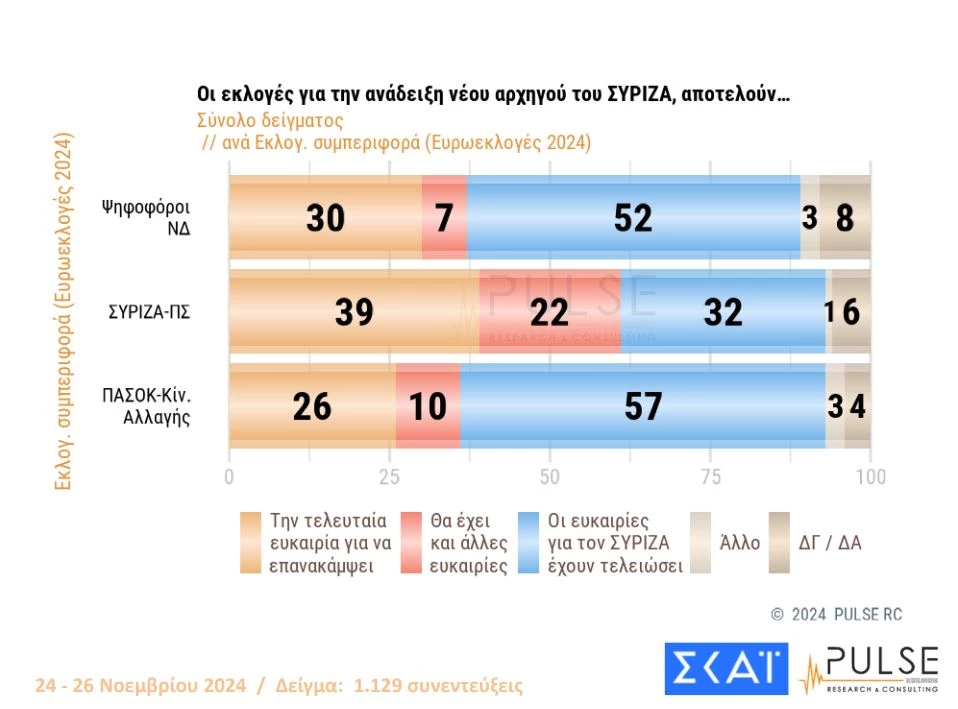 Για τις προεδρικές εκλογές του ΣΥΡΙΖΑ, το 49% των ερωτηθέντων υποστηρίζει πως «οι ευκαιρίες για τον ΣΥΡΙΖΑ έχουν τελειώσει», το 26% πως «αυτή είναι η τελευταία ευκαιρία να επανακάμψει» και το 11% πως «θα έχει και άλλες ευκαιρίες».