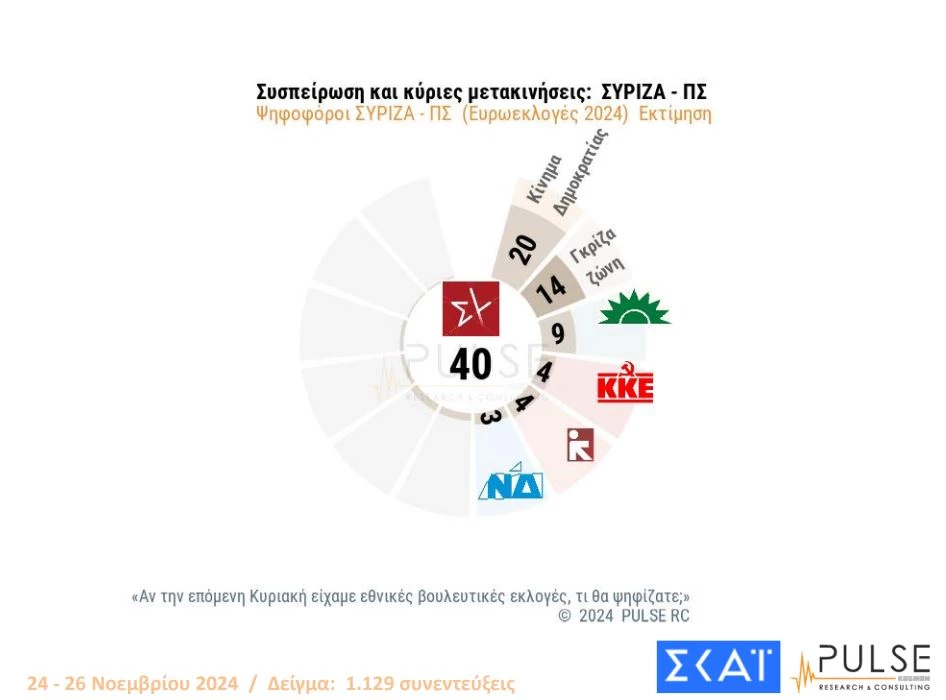Ο ΣΥΡΙΖΑ βρίσκεται στο 40% της συσπείρωσης, χάνοντας το 20% της δύναμής του προς το Κίνημα Δημοκρατίας του Στέφανου Κασσελάκη, 14% προς τη «γκρίζα ζώνη», προς το ΠΑΣΟΚ 9%, προς το ΚΚΕ 4%, προς τη Νέα Αριστερά 4% και προς τη Νέα Δημοκρατία 3%.