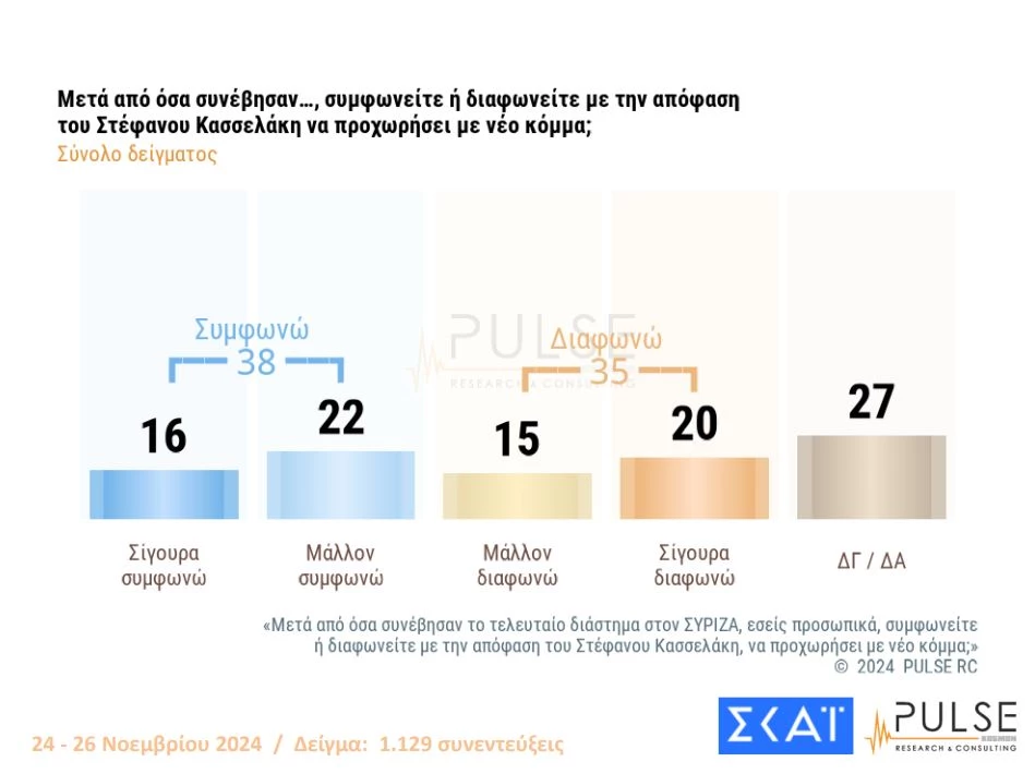 Σε ερώτημα για τη συμφωνία ή διαφωνία με την απόφαση του Στέφανου Κασσελάκη να φτιάξει νέο κόμμα, το 38% απαντά συμφωνώ και το 35% διαφωνώ. Στην αντίστοιχη ερώτηση στους ψηφοφόρους του ΣΥΡΙΖΑ, το 62% λέει «συμφωνώ ή μάλλον συμφωνώ» και το 27% «διαφωνώ ή μάλλον διαφωνώ».