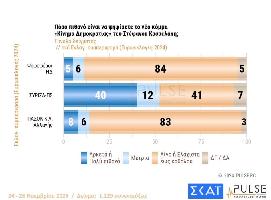 Σε ερώτηση πόσο πιθανό είναι να ψηφίσετε το κόμμα Κασσελάκη, το 11% επί του συνόλου των ψηφοφόρων δηλώνει «πολύ και αρκετά πιθανό», «μέτρια» δηλώνει το 7%, «λίγο και ελάχιστα ως καθόλου» απαντά το 75%.