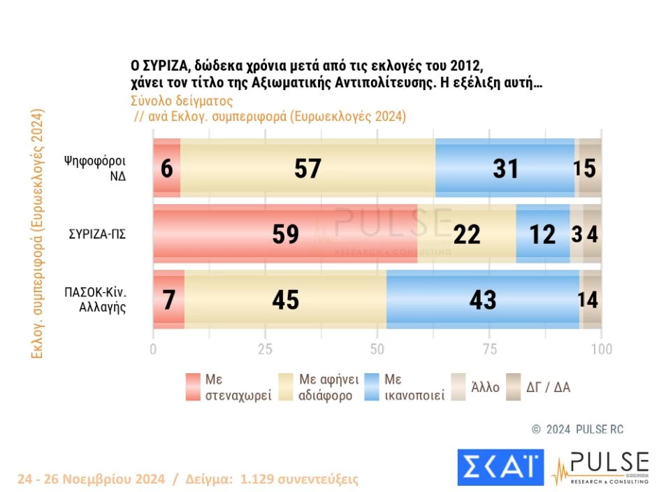 Όταν η ίδια ερώτηση γίνεται σε ψηφοφόρους του ΣΥΡΙΖΑ εκείνοι σε ποσοστό 59% δηλώνουν πως τους στεναχωρεί, 22% πως τους αφήνει αδιάφορους και 12% πως… τους ικανοποιεί.