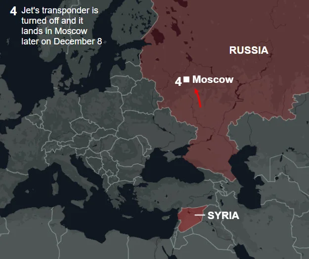 Στη συνέχεια, το προεδρικό τζετ πιστεύεται ότι προσγειώθηκε στη βάση, όπου ο Άσαντ μεταφέρθηκε σε ρωσικό στρατιωτικό αεροπλάνο που πέταξε κάτω από τα ραντάρ με κατεύθυνση τη Μόσχα.