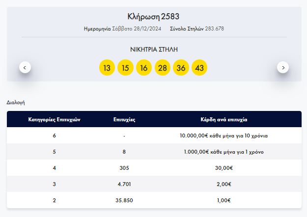 Στην κλήρωση ΛΟΤΤΟ αριθμός 2583, σήμερα Σάββατο 28/12/2024 τυχεροί αριθμοί είναι 16, 36, 28, 15, 13 και 43.