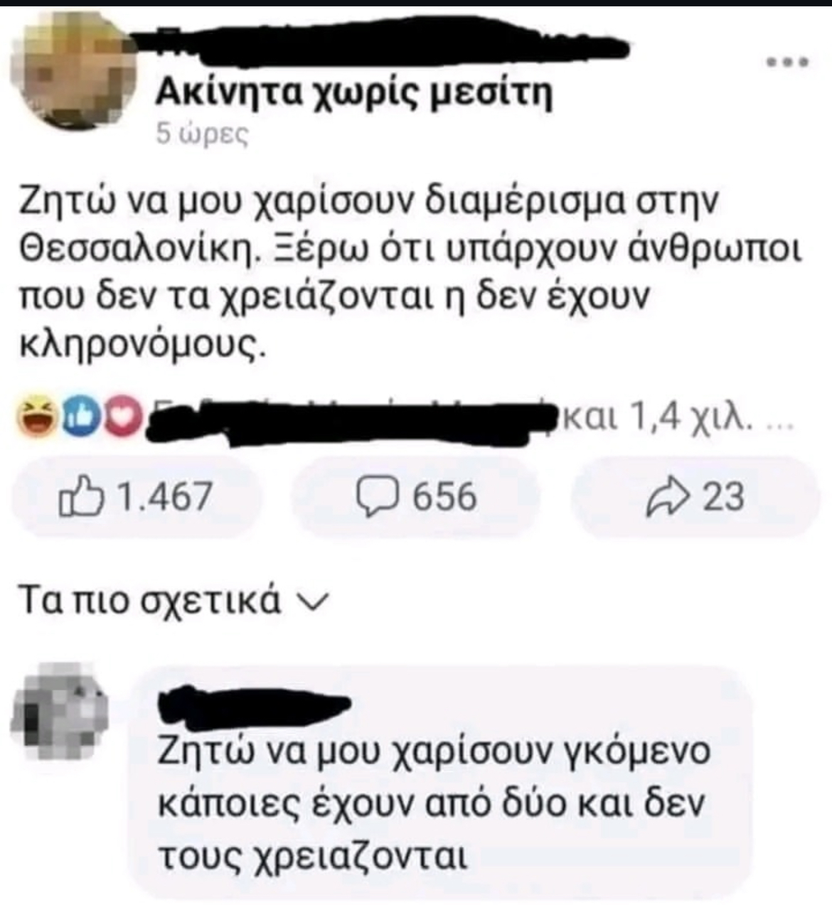 Ο διαδικτυακός χρήστης ζήτησε πολύ απλά να του χαρίσει κάποιος ένα σπίτι, που δεν το χρειάζεται. Τόσο εύκολο. Σκέφτηκε πόσα ακίνητα μαραζώνουν και λέει «γιατί να πάνε χαμένα, αφού μπορώ να τα αξιοποιήσω εγώ;» και έτσι προχώρησε σε μία αγγελία viral.