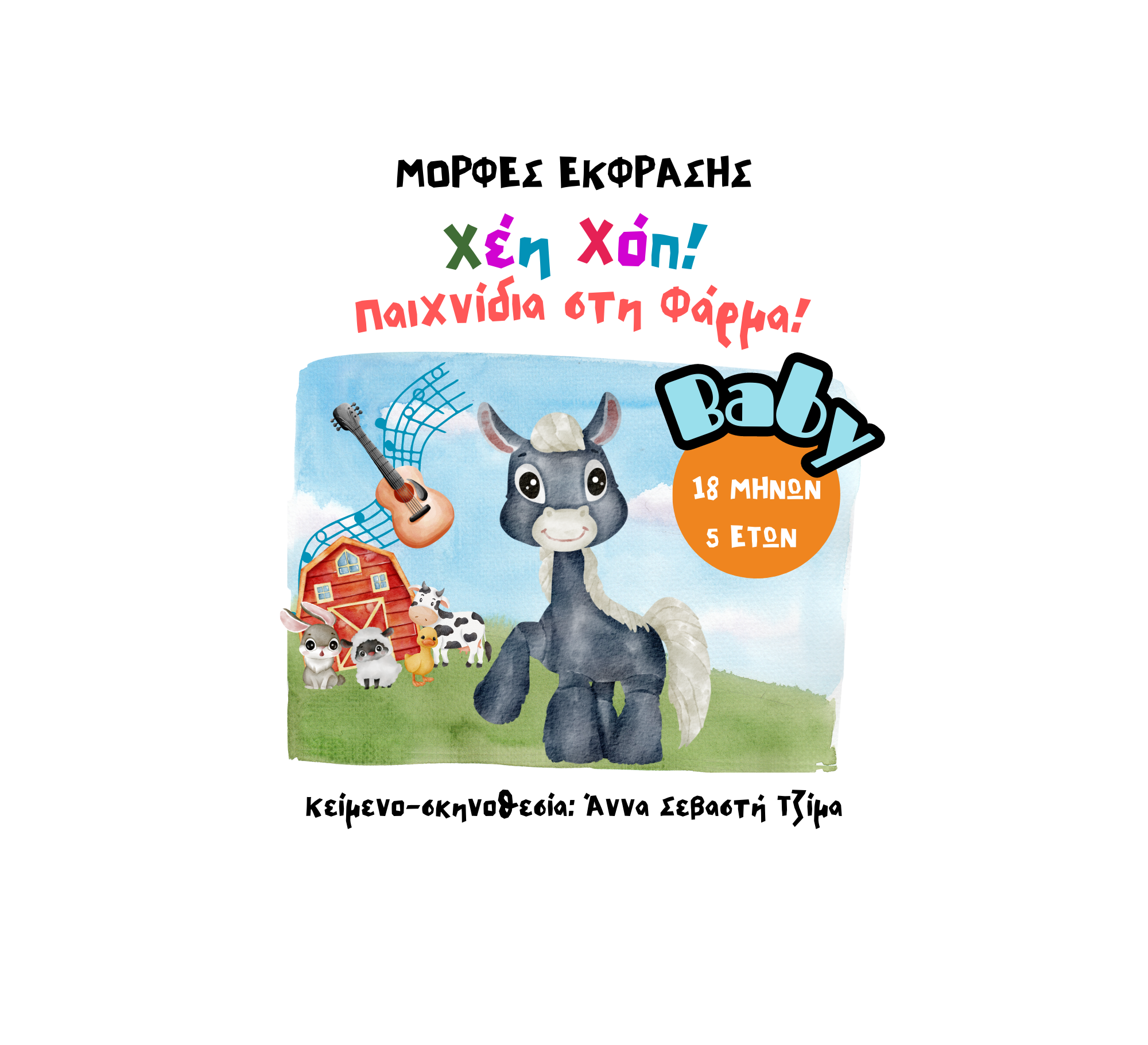 Μια καινούργια μέρα ξεκινά σε μια όμορφη φάρμα… Όμως πού πήγαν τα ζωάκια; «Χέη Χόπ!» Ας καβαλήσουμε τα αλογάκι μας για να πάμε να βρούμε! Μια παράσταση γεμάτη μουσική, τραγούδι και παιχνίδι για βρέφη από 18 μηνών και μικρά παιδιά έως 5 ετών! Ελάτε να παίξουμε όλοι μαζί και να βρούμε τα άτακτα ζωάκια της φάρμας! Η Άννα Σεβαστή Τζίμα , η δημιουργός της sold out παράστασης για βρέφη και μικρά παιδιά «Κού-Κου! Μια βόλτα στο δάσος» και του «Λάλαλιλαλο! Χριστουγεννιάτικη έκπληξη..» μας προσκαλεί στους αγρούς για να ανακαλύψουμε τη ζωή σε μια φάρμα!