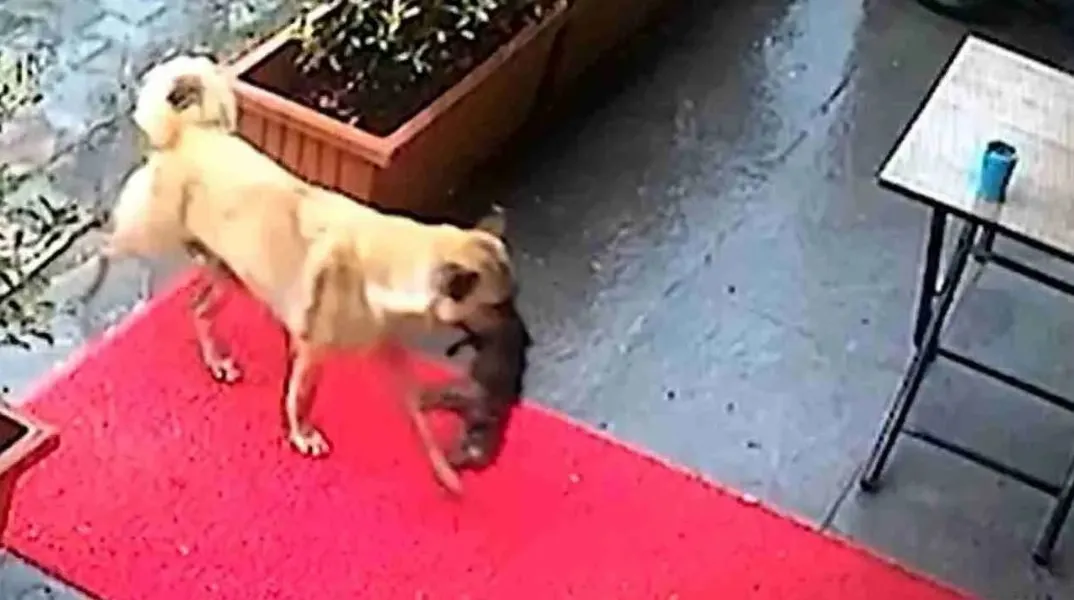 Το υλικό από κάμερες ασφαλείας δείχνει την αδέσποτη σκυλίτσα να μεταφέρει το εξαντλημένο κουτάβι της στο στόμα, μέσα στη βροχή και να το αφήνει στην πόρτα κτηνιατρικής κλινικής στην περιοχή Ατνάν Καβέτσι, στο Μπεϊλικούζου, στην επαρχία Κωνσταντινούπολης.