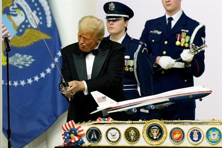 Σε μια από τις εορταστικές εκδηλώσεις που εμφανίστηκε μετά την ορκωμοσία του ο Ντόναλντ Τραμπ έκοψε μια τούρτα μαζί με τον αντιπρόεδρό του, Τζέι Ντι Βανς, κρατώντας δύο σπαθιά.