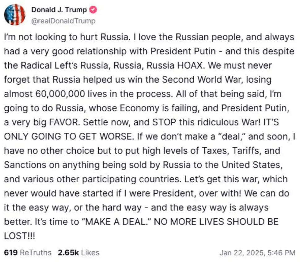 «Ήρθε η ώρα να βρούμε μια συμφωνία», έγραψε ο Τραμπ στο Truth Social, λέγοντας: «Δεν προσπαθώ να βλάψω τη Ρωσία. Αγαπώ τον ρωσικό λαό και πάντα είχα μια πολύ καλή σχέση με τον πρόεδρο Πούτιν».