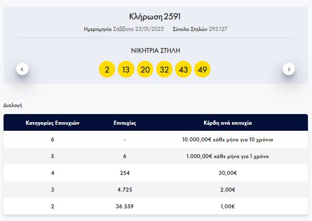 Στην κλήρωση ΛΟΤΤΟ αριθμός 2591, σήμερα Σάββατο 25/01/2025 οι τυχεροί αριθμοί είναι 32, 20, 43, 13, 49, 2.