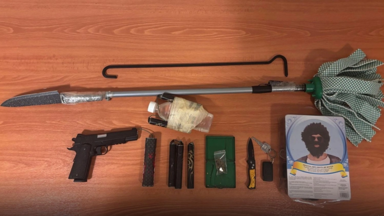 Όταν οι αστυνομικοί προχώρησαν σε έλεγχο του οχήματός του, ανακάλυψαν αυτοσχέδια όπλα, εμπρηστικό μηχανισμό, αεροβόλο πιστόλι και κροτίδες. Μεταξύ των αντικειμένων, εντοπίστηκε μια περίεργη κατασκευή που αποτελούνταν από σφουγγαρίστρα, στην οποία είχε προσαρμόσει μαχαίρι με κολλητική ταινία στη μία άκρη και κροτίδα στην άλλη.