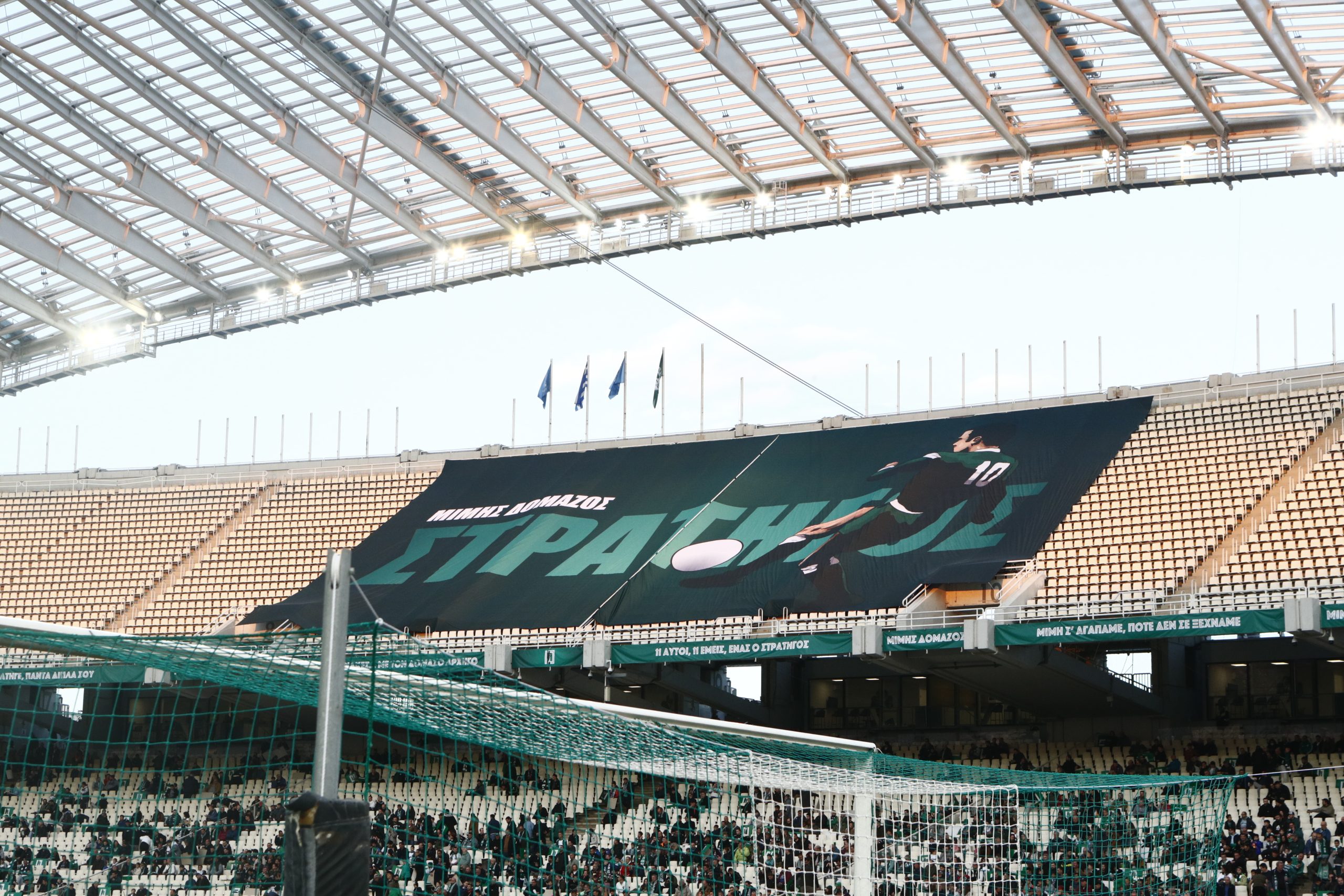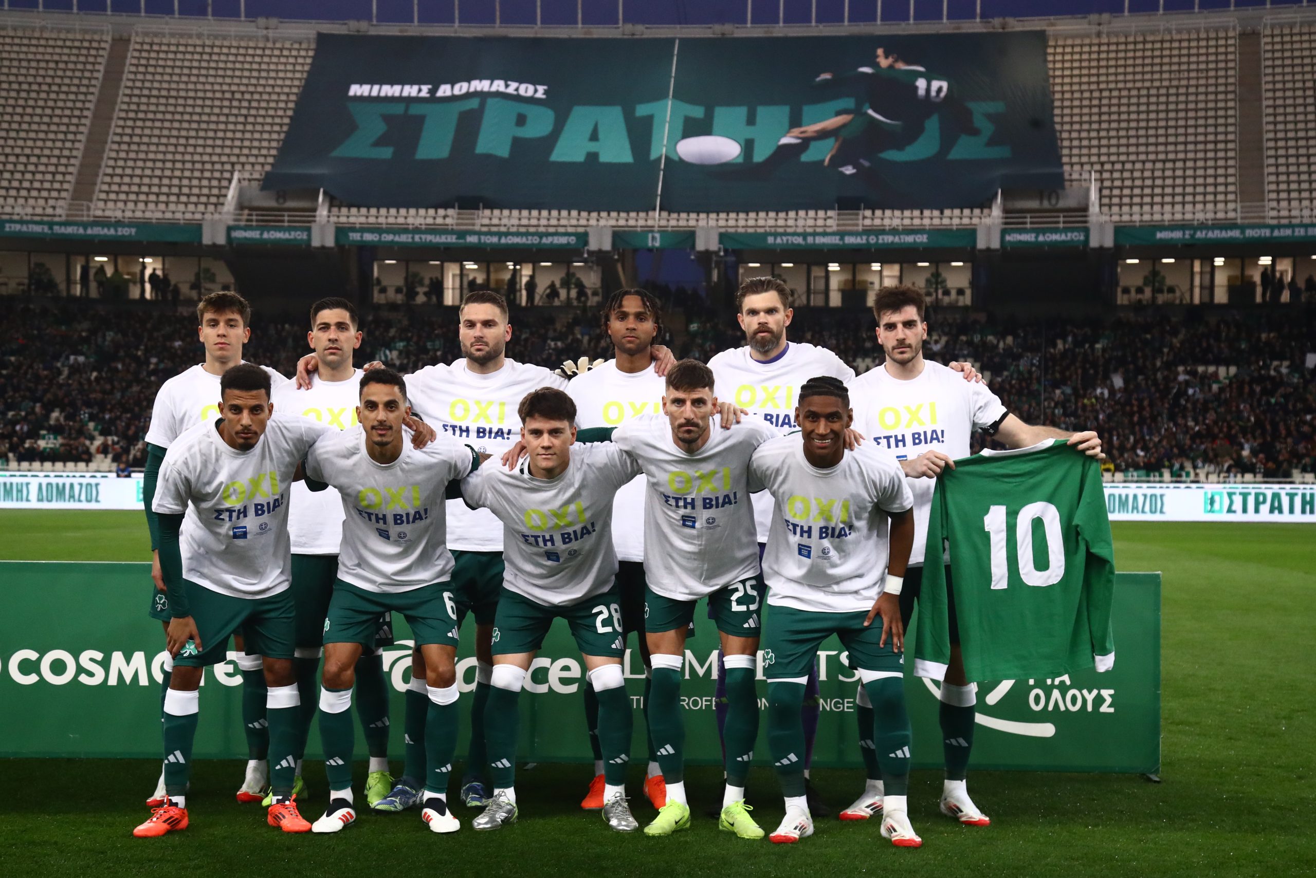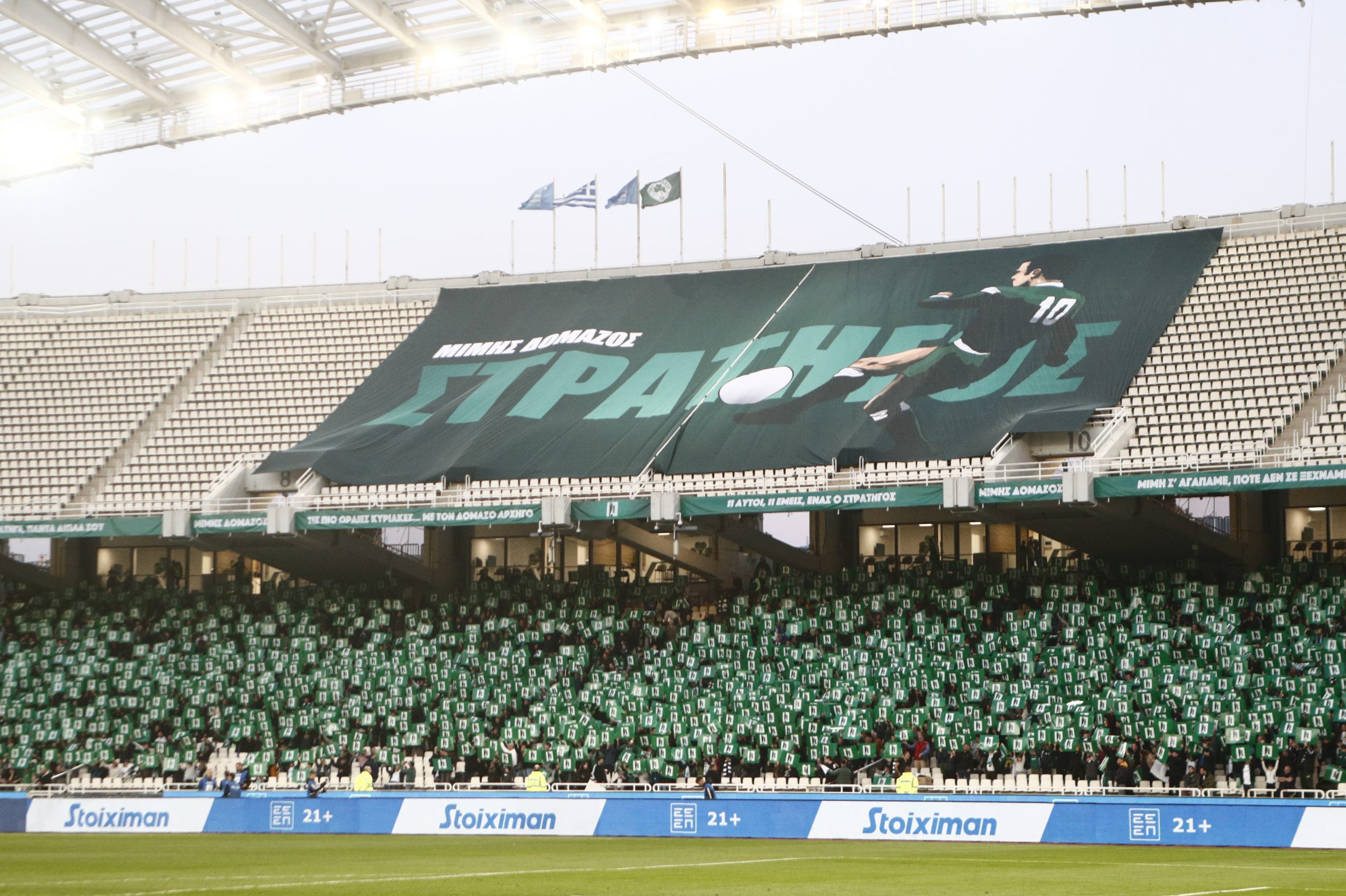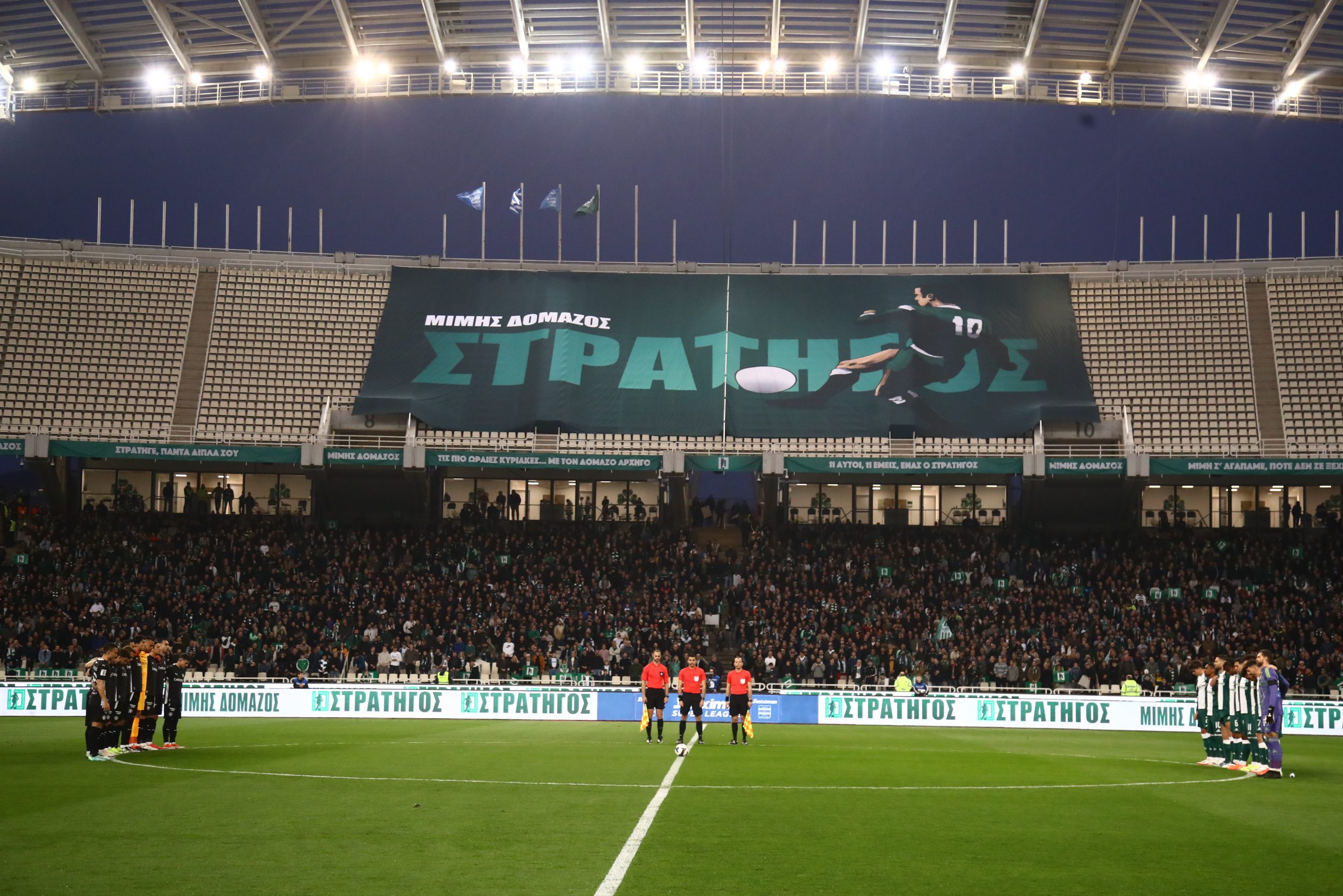 Πριν από τη σέντρα όλη η ποδοσφαιρική ομάδα του Παναθηναϊκού πέρασε μπροστά απ’ τη φυσούνα όπου υπήρχε μία μεγάλη φωτογραφία του «Στρατηγού» και λουλούδια, ακριβώς κάτω απ’ τη θέση στα VIP που καθόταν πάντα ο Μίμης Δομάζος μαζί με τον «Διόσκουρό» του Αντώνη Αντωνιάδη κι έβλεπαν παρέα τους αγώνες του αγαπημένου τους Παναθηναϊκού.