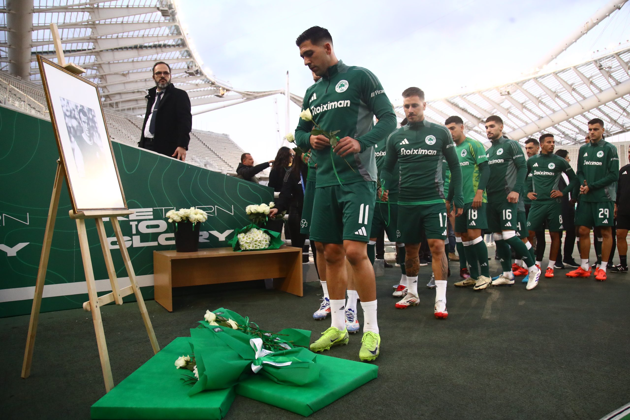Όλοι οι παίκτες πέρασαν μπροστά απ’ το σημείο για να αποτίσουν φόρο τιμής, ενώ τελευταίοι πέρασαν οι παλαίμαχοι άσοι του Παναθηναϊκού απ’ την ομάδα του Γουέμπλεϊ, που «αποχαιρέτισαν» με τη σειρά τους τον φίλο και συμπαίκτη τους.