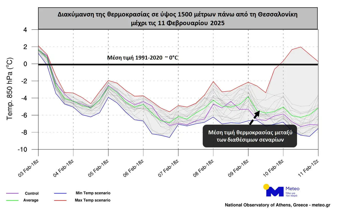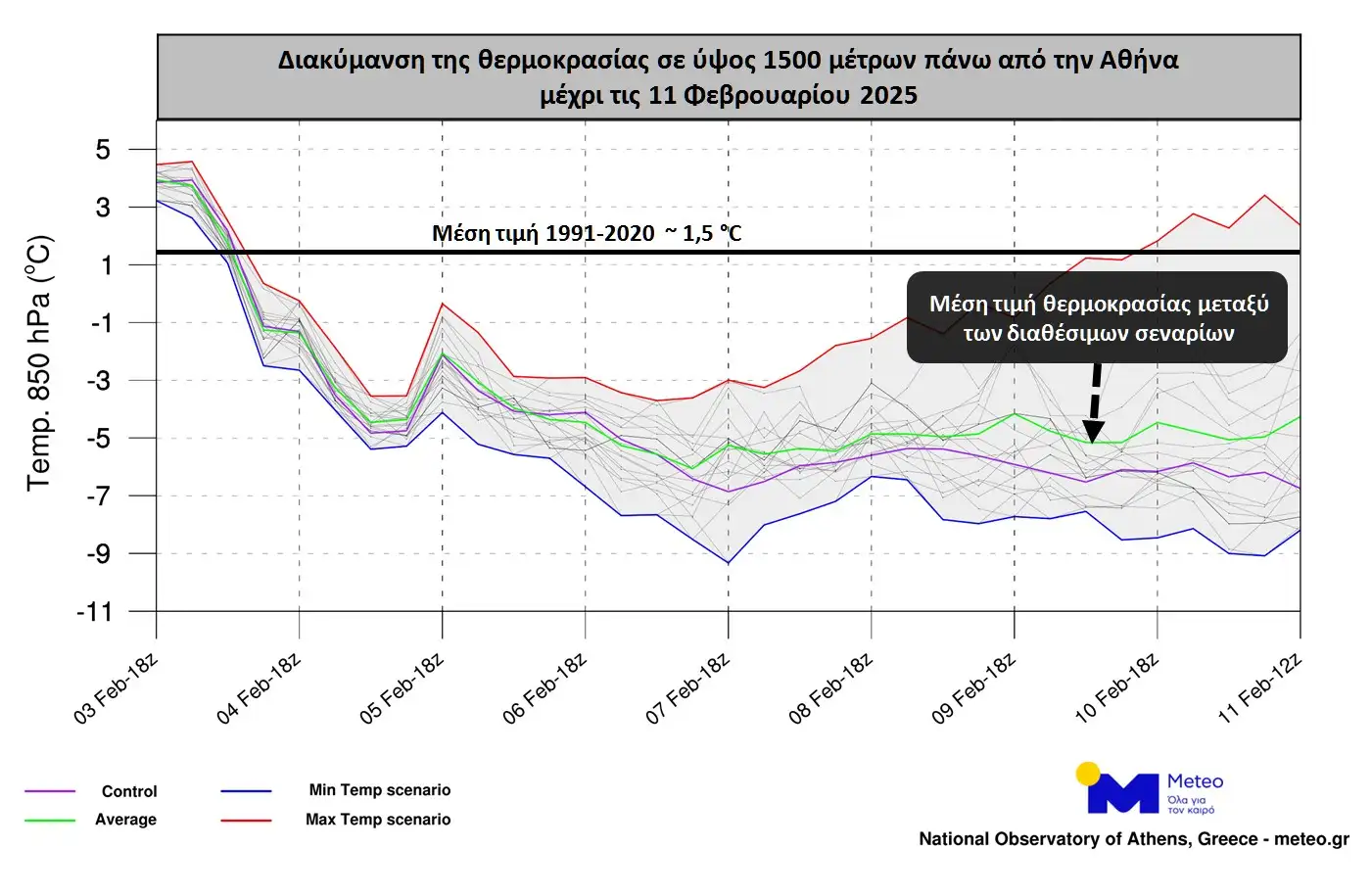 Στην εικόνες που ακολουθούν παρουσιάζεται ενδεικτικά το εύρος διακύμανσης της θερμοκρασίας έως τις 11 Φεβρουαρίου σε ύψος 1.500 περίπου μέτρων επάνω από την Αθήνα και τη Θεσσαλονίκη.