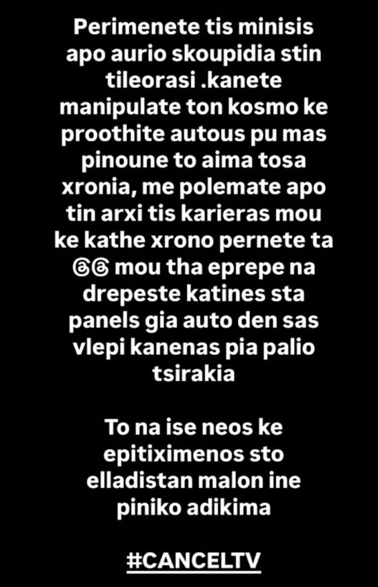 «Περιμένετε τις μηνύσεις από αύριο, σκουπίδια της τηλεόρασης. Χειρίζεστε τον κόσμο και προωθείτε αυτούς που μας πίνουν το αίμα τόσα χρόνια. Με πολεμάτε από την αρχή της καριέρας μου και κάθε παίρνετε τα …. μου. Θα έπρεπε να ντρέπεστε κατίνες. Το να είσαι νέος και επιτυχημένος στο Ελλαδιστάν μάλλον είναι ποινικό αδίκημα», έγραψε πάνω σε φωτογραφία.