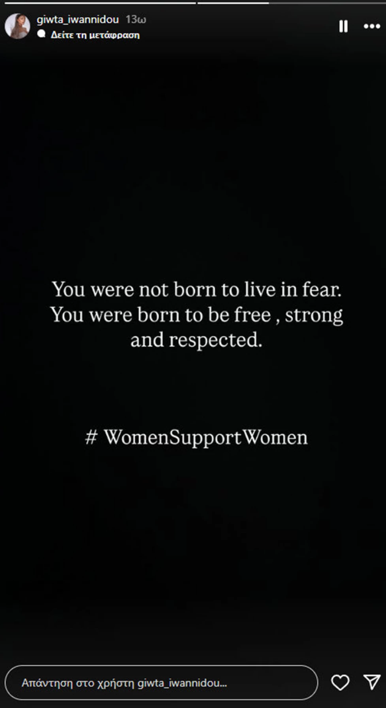 «Δεν έχεις γεννηθεί για να ζεις με τον φόβο. Γεννήθηκες για να είσαι ελεύθερος δυνατός και να σε σέβονται», έγραψε στα αγγλικά η Γιώτα Ιωαννίδου, στέλνοντας μήνυμα για γυναικεία υποστήριξη.