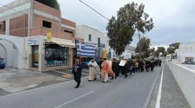 Ειδικότερα, οι κάτοικοι και οι κληρικοί κρατούσαν ελληνικές σημαίες, λάβαρα και ιερά κειμήλια, διασχίζοντας τους δρόμους του χωριού, ζητώντας την προστασία του Θεού ώστε να φέρει την ηρεμία στην περιοχή. Η λιτανεία, που αποτελεί μια παράδοση δεκαετιών στο νησί, είχε φέτος έναν ιδιαίτερο συμβολισμό, καθώς οι κάτοικοι εκφράζουν την ανησυχία τους για τις συνεχείς σεισμικές δονήσεις που σημειώνονται στην περιοχή τις τελευταίες ημέρες.