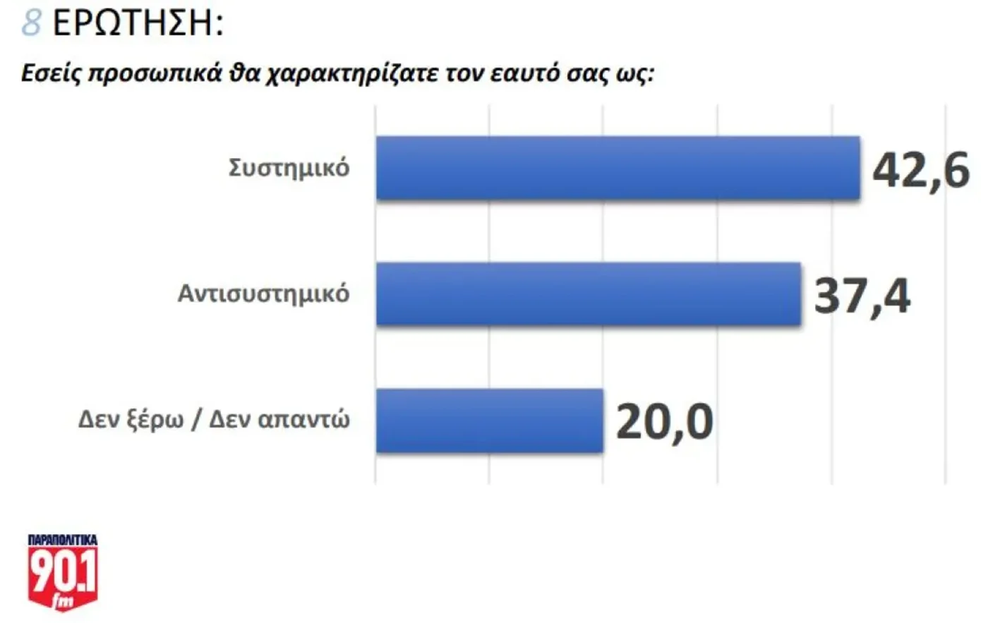 Στην ίδια δημοσκόπηση ερευνάται το πώς τοποθετούνται οι πολίτες απέναντι στον αντισυστημισμό.