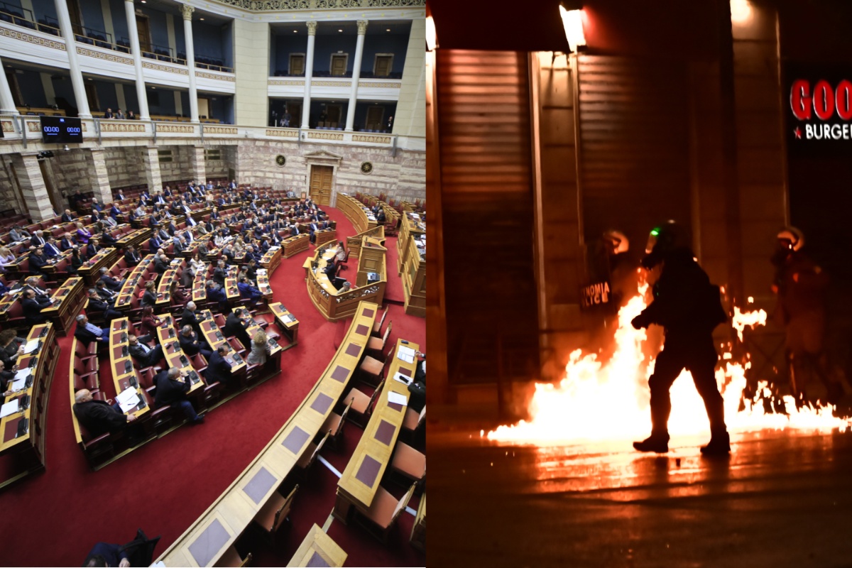 Τα επεισόδια ήταν εκτεταμένα μετά τη νέα συγκέντρωση για τα Τέμπη με την ένταση να περνάει και στο κοινοβούλιο όπου συζητείται η πρόταση μομφής κατά της κυβέρνησης