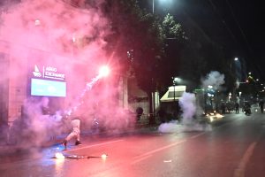 Άγνωστοι έβαλαν φωτιά σε κάδους, δημιουργώντας οδόφραγμα στην άσφαλτο, στο κάτω μέρος της πλατείας και πετούσαν αντικείμενα προς τους αστυνομικούς.