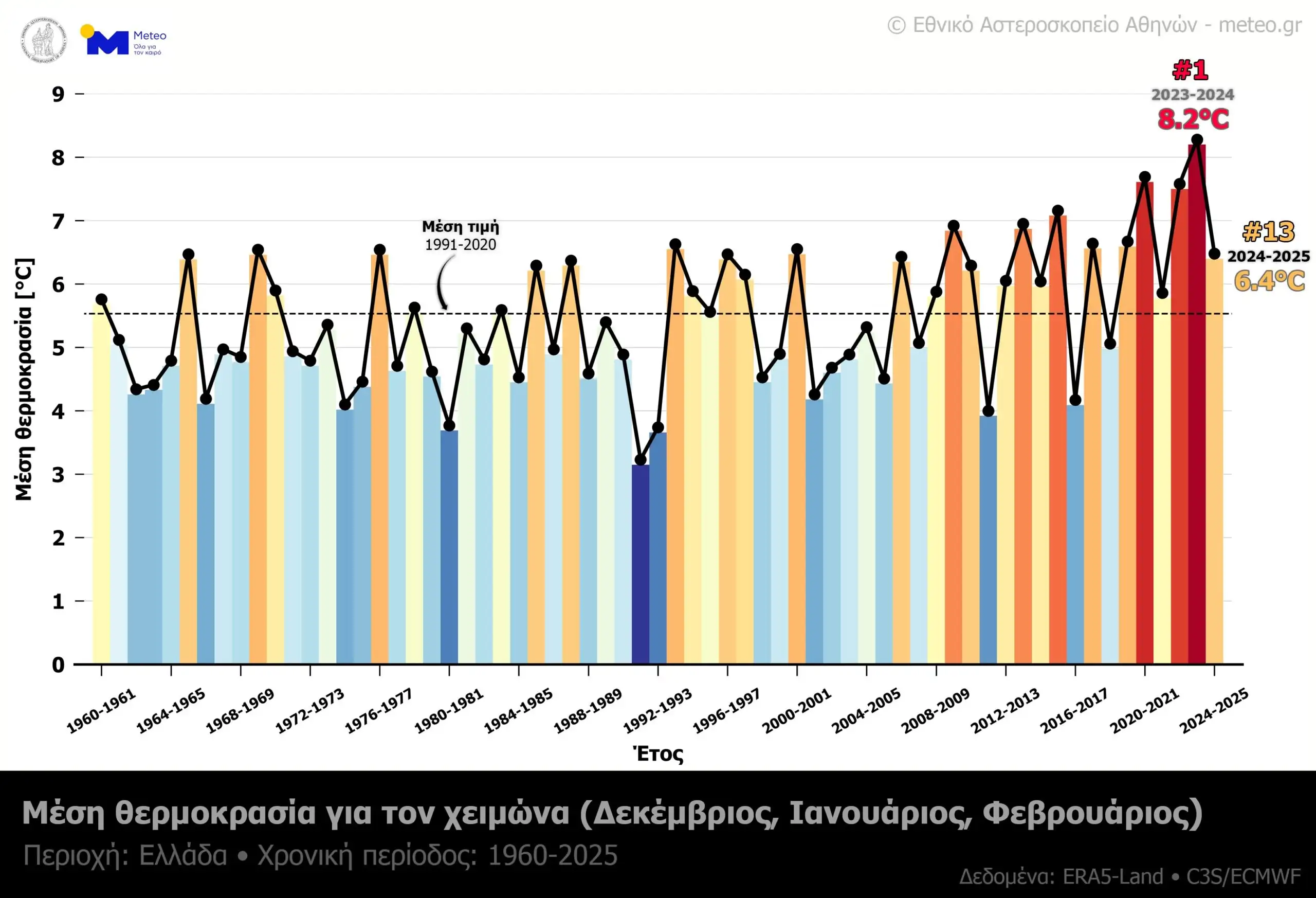 Η μέση θερμοκρασία στην Ελλάδα από το 1960 μέχρι και το 2025 για την περίοδο του χειμώνα παρουσιάζει άνοδο κατά 1.8 °C.