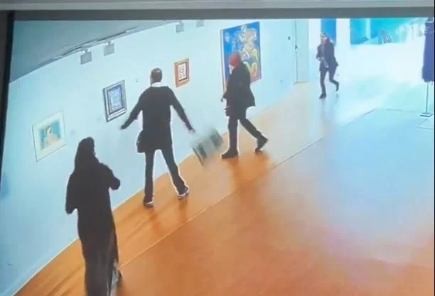 Στο βίντεο καταγράφεται η στιγμή που ο βουλευτής βρίσκεται στον χώρο της έκθεσης στην Εθνική Πινακοθήκη, μαζί με έναν συνεργάτη του, και, ξαφνικά αρπάζουν τα έργα και τα πετούν στο πάτωμα.