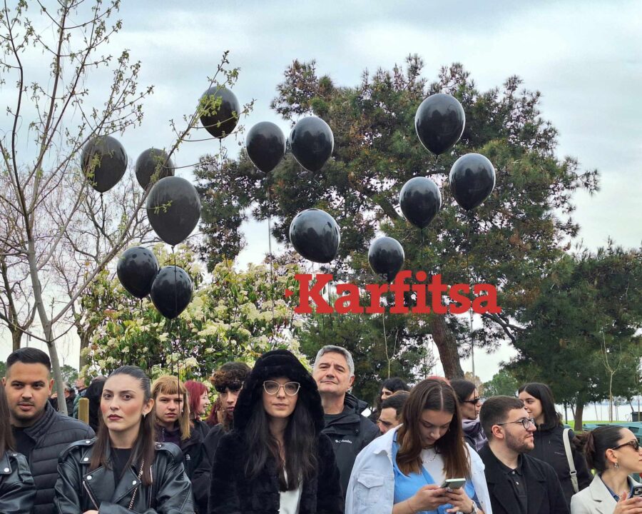 Μαύρα μπαλόνια και πλακάτ που γράφει «Δικαιοσύνη» ύψωσαν φοιτητές για τα Τέμπη κατά τη διάρκεια της παρέλασης της 25ης Μαρτίου στη Θεσσαλονίκη.