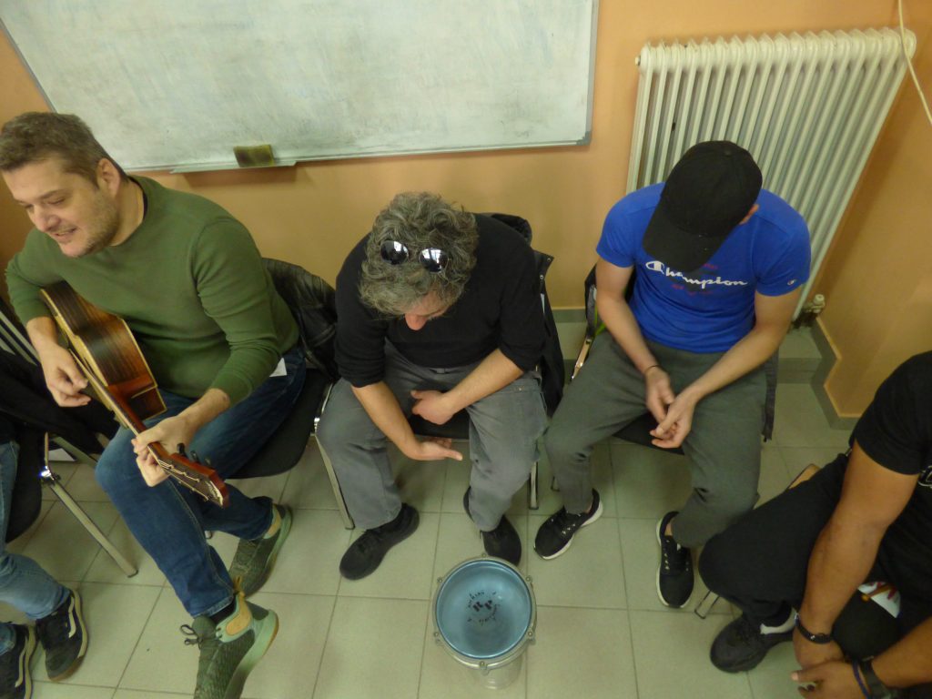 Ανάμεσά τους, βρίσκονται οι μουσικοί Αλέξανδρος Ιωάννου και Αλέξανδρος Μποτσφάρης με τους οποίους πορεύτηκαν όλο αυτό το διάστημα, καθώς και ο Δημήτρης Δημητρόπουλος, που ήταν η τελευταία προσθήκη στην ομάδα και συνόδευε τα κρουστά με την κιθάρα και τη φωνή του. Οι τρεις τους έκαναν λόγο για μία μοναδική εμπειρία, αφού έως τώρα δεν είχαν ζήσει κάτι αντίστοιχο, μίλησαν για τον κώδικα επικοινωνίας που κατάφεραν να αναπτύξουν με τους κρατούμενους – συμμετέχοντες στο εργαστήριο και φυσικά για τις δυσκολίες που συνάντησαν στις είκοσι συναντήσεις τους από τον περασμένο Νοέμβριο έως σήμερα, που είχαν να κάνουν τόσο με τη γλώσσα, όσο και με προσθαφαιρέσεις συμμετεχόντων, που οφείλονταν σε κάποιες αποφυλακίσεις.