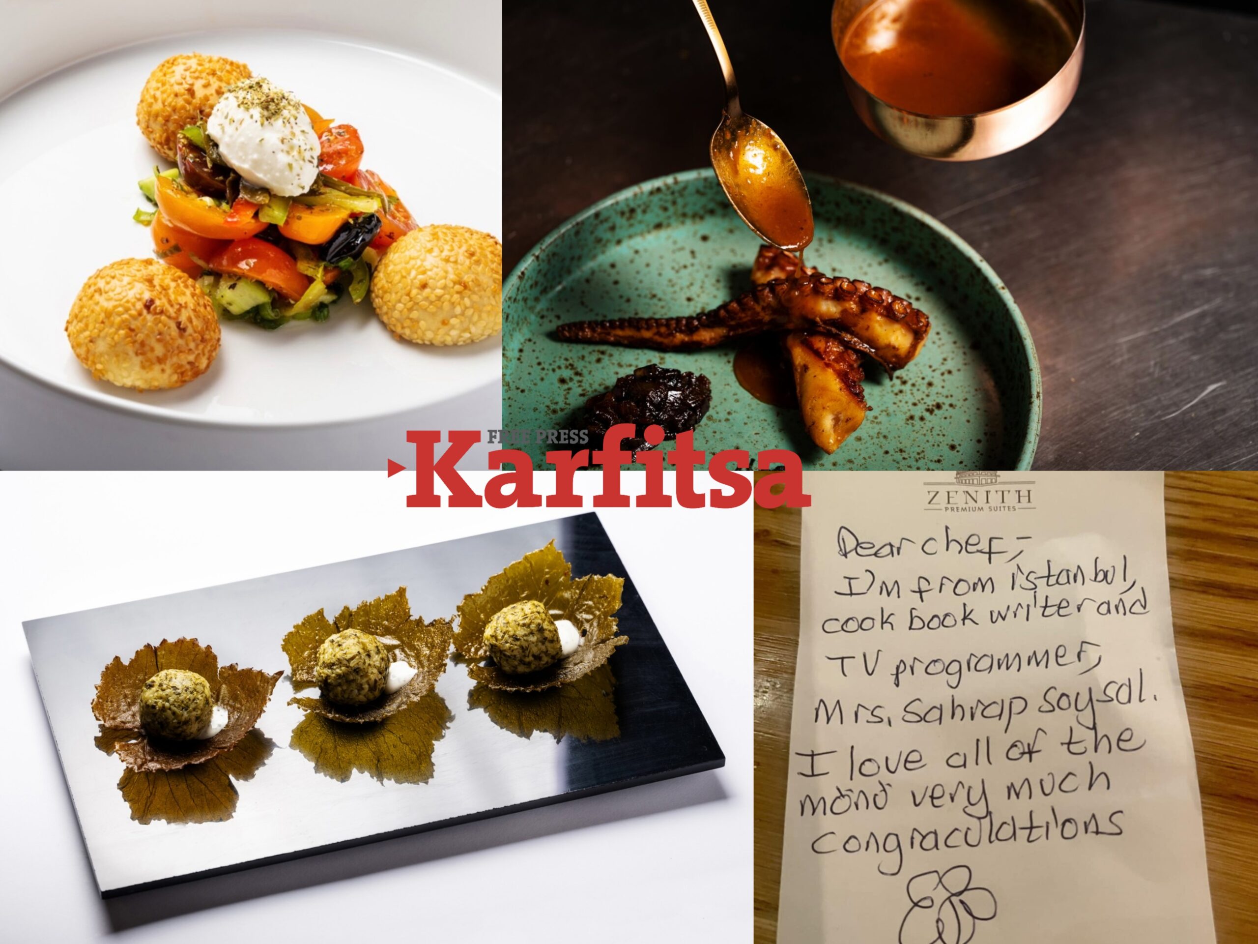 «Χθες ήρθε η κυρία Sahrap Soysal με την οικογένειά της για φαγητό. Δεν την καταλάβαμε στην αρχή, ενώ είναι γνωστή. Μετά όμως μου έφερε ο σερβιτόρος αυτό το χαρτάκι, ήθελε να με γνωρίσει. Μιλήσαμε. Της άρεσε πολύ η ελληνική κουζίνα. Ήταν πολύ ευχάριστο για μένα να ακούω τα καλά της χρόνια και πολύ τιμητικό για το εστιατόριο», αναφέρει στην Karfitsa ο κ. Καλαϊτζίδης.