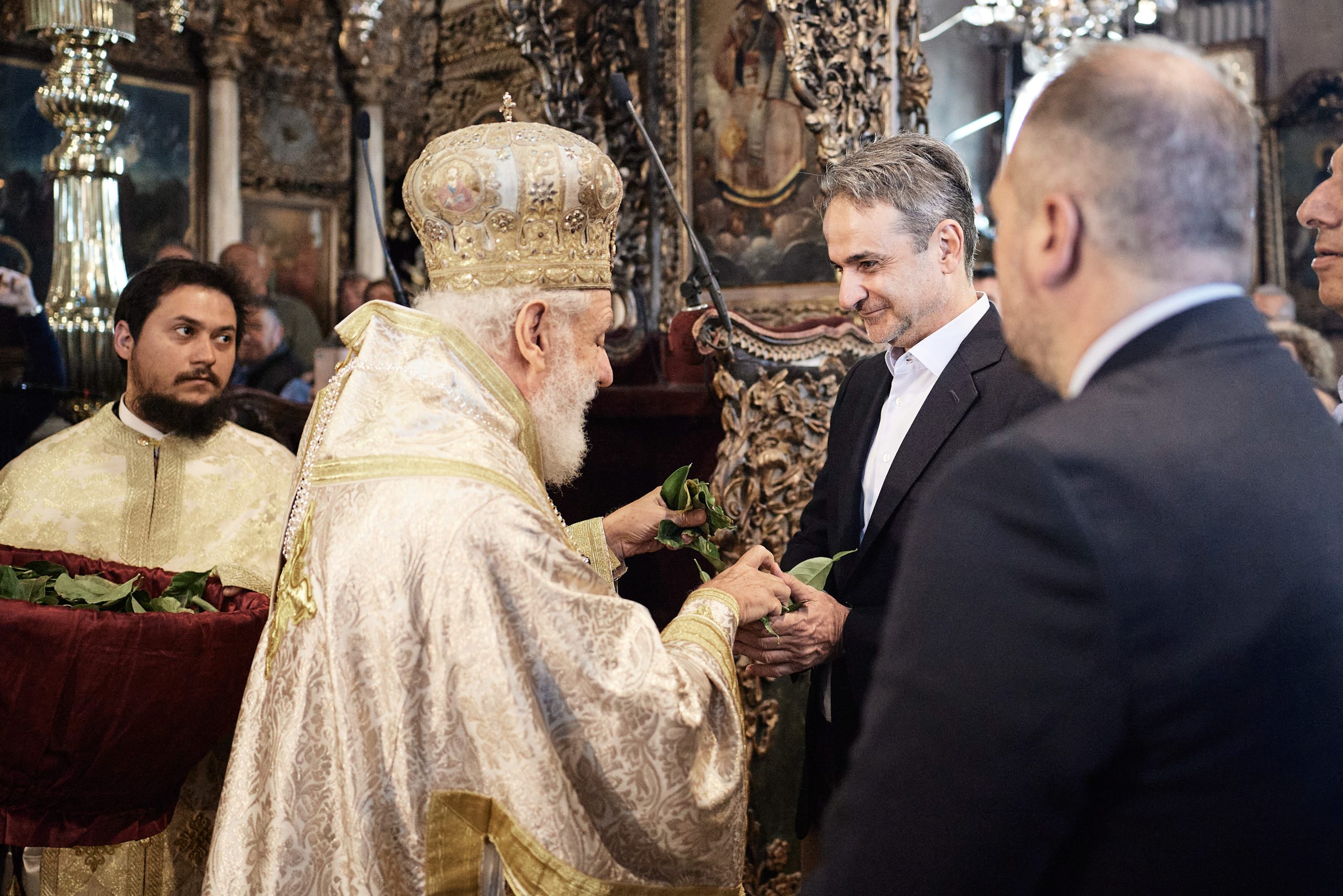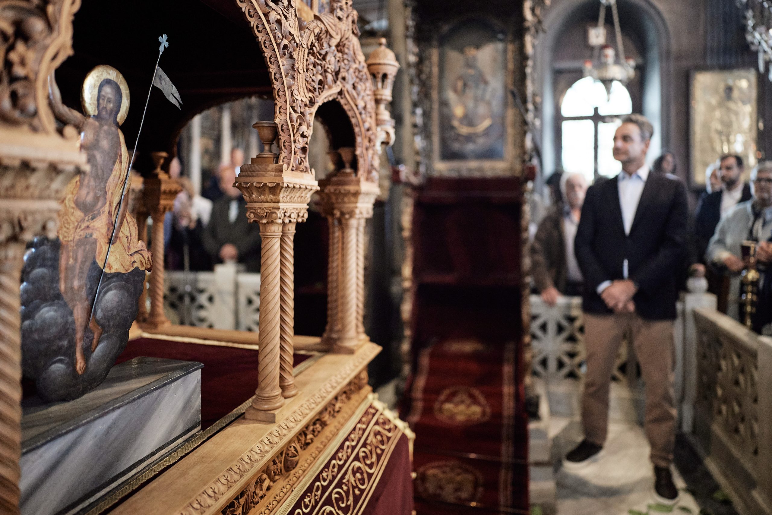 Ο πρωθυπουργός Κυριάκος Μητσοτάκης παρακολούθησε τη Θεία Λειτουργία της πρώτης Αναστάσεως στον Ιερό Ναό Ευαγγελιστρίας Τήνου.