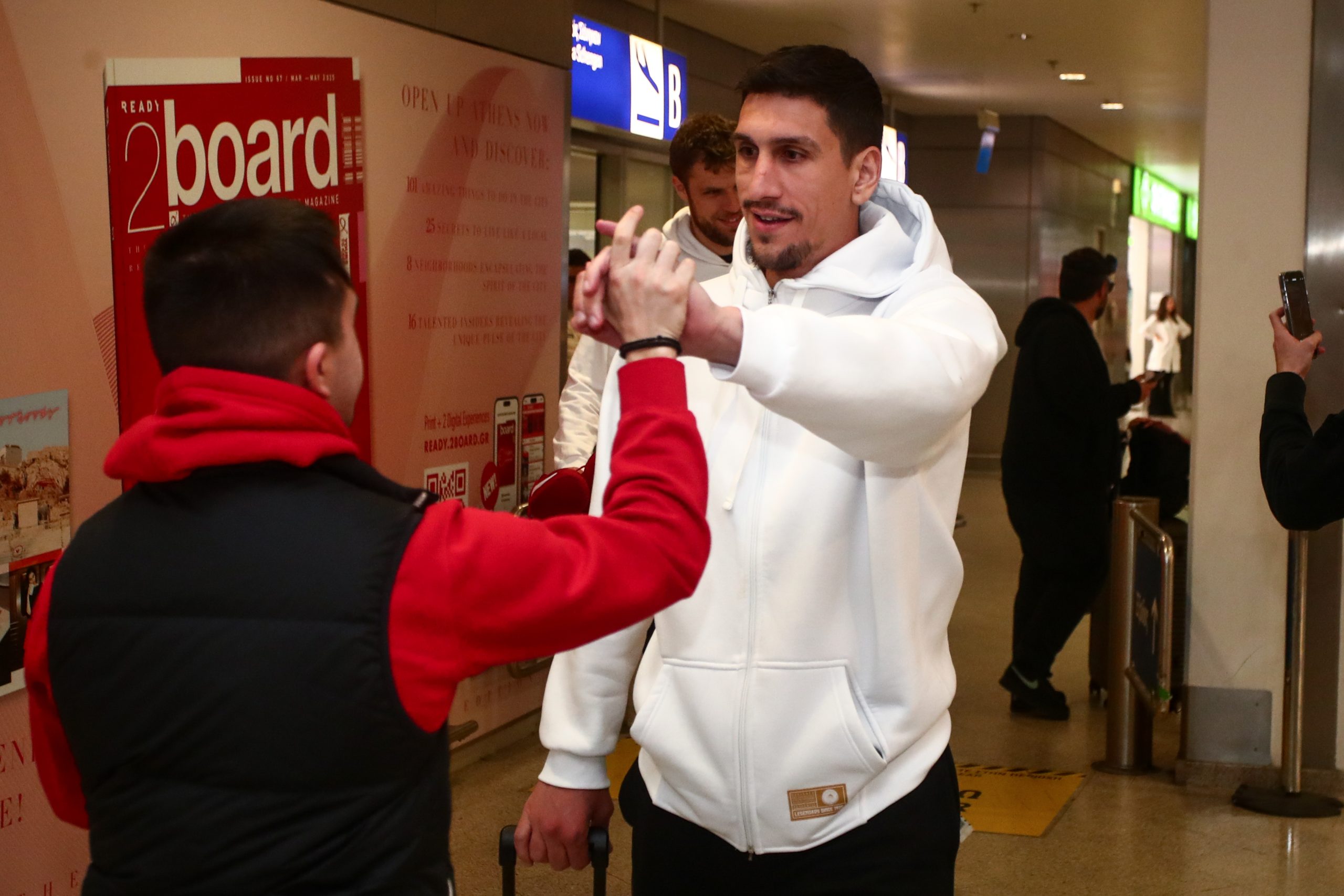 Αν και κουρασμένοι οι παίκτες του Ολυμπιακού, αφού μετά τη νίκη και την πρόκριση στο Final 4 της Ευρωλίγκας, επέστρεψαν κατευθείαν Ελλάδα, δεν έχασαν το χαμόγελο τους και πόζαραν με τους φιλάθλους στο αεροδρόμιο.