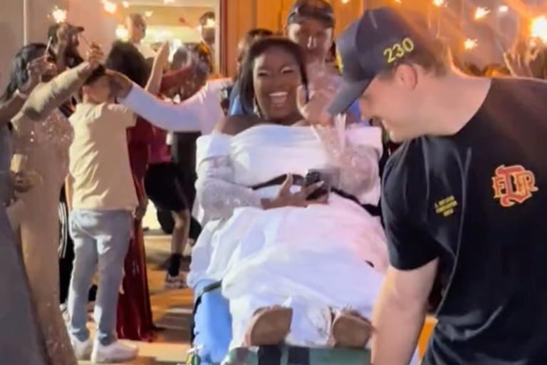 Η πτώση της προκάλεσε ζημιά στο μηριαίο οστό, ρήξη συνδέσμων και στραβό γόνατο, οδηγώντας τη σε φορείο και τελικά στο νοσοκομείο. Ωστόσο, δεν άφησε το ατύχημα να καταστρέψει τη μέρα της. Οι καλεσμένοι τη χαιρέτησαν ενθουσιασμένοι καθώς την έβγαζαν από την αίθουσα με το φορείο και φυσικά οι εικόνες έγιναν viral γρήγορα!