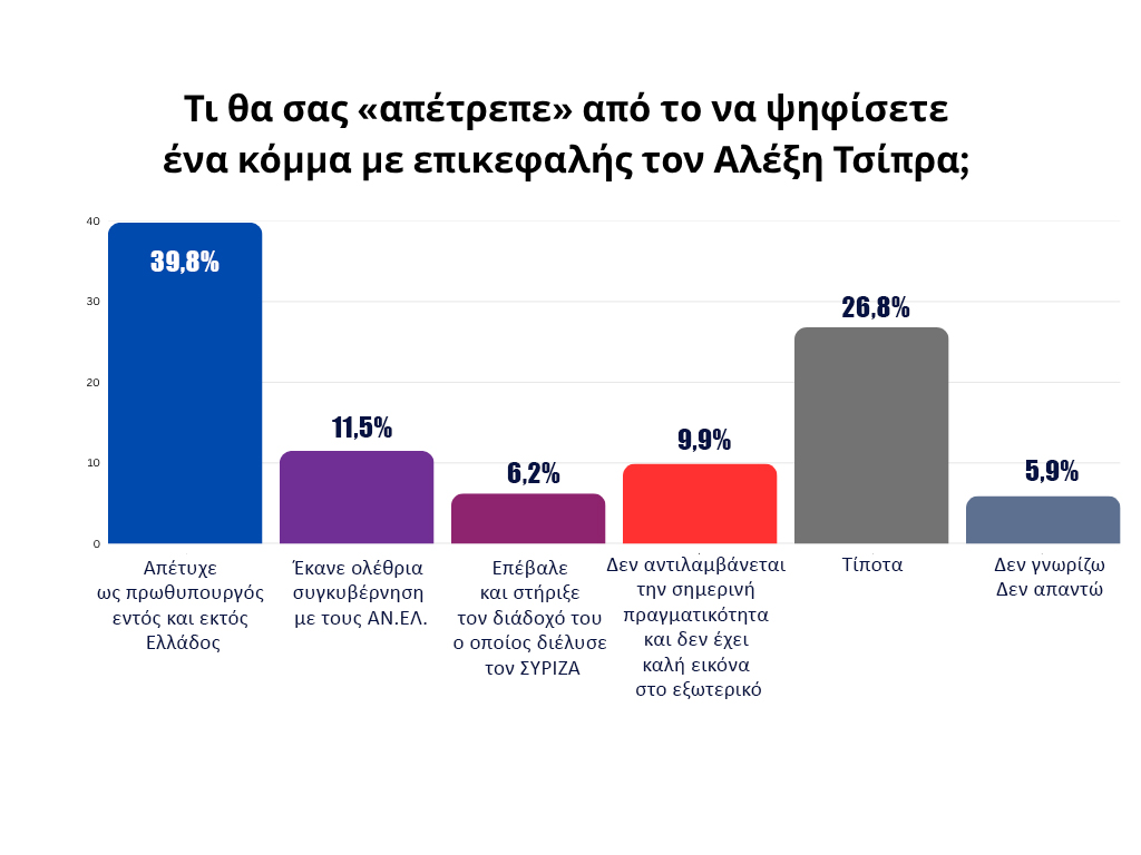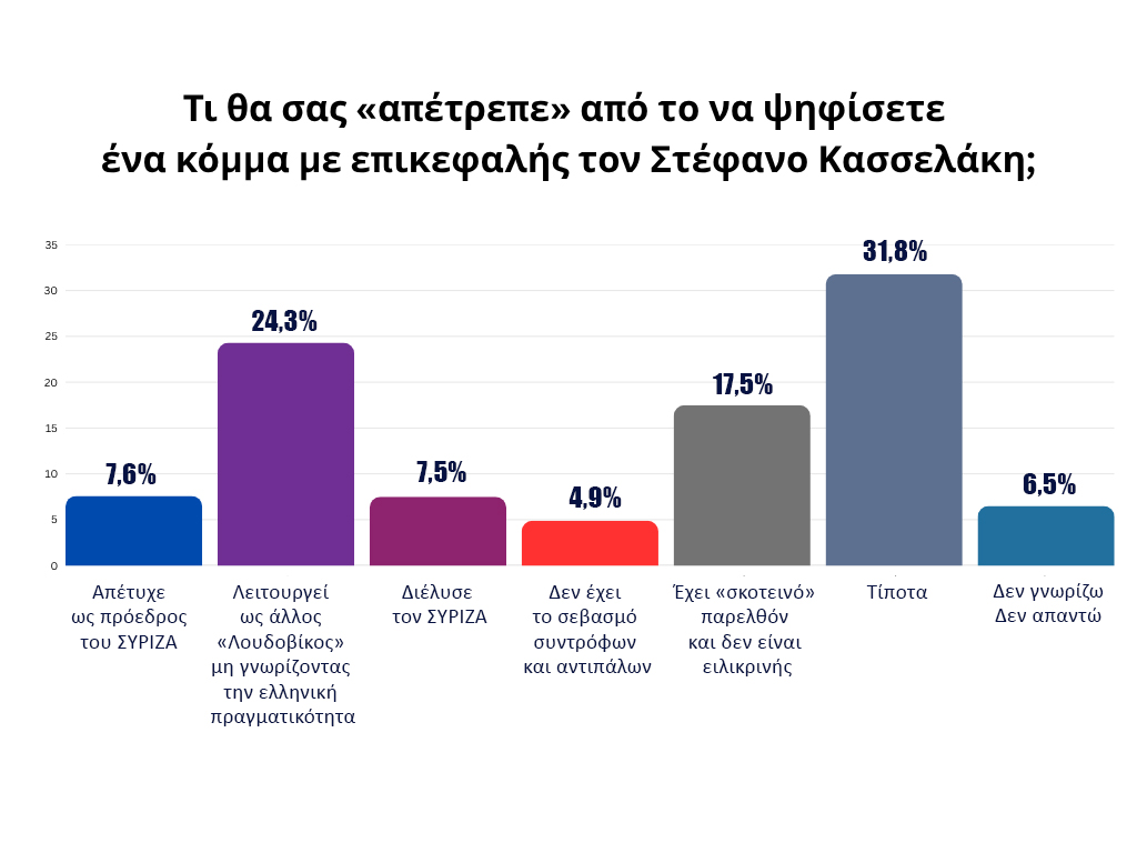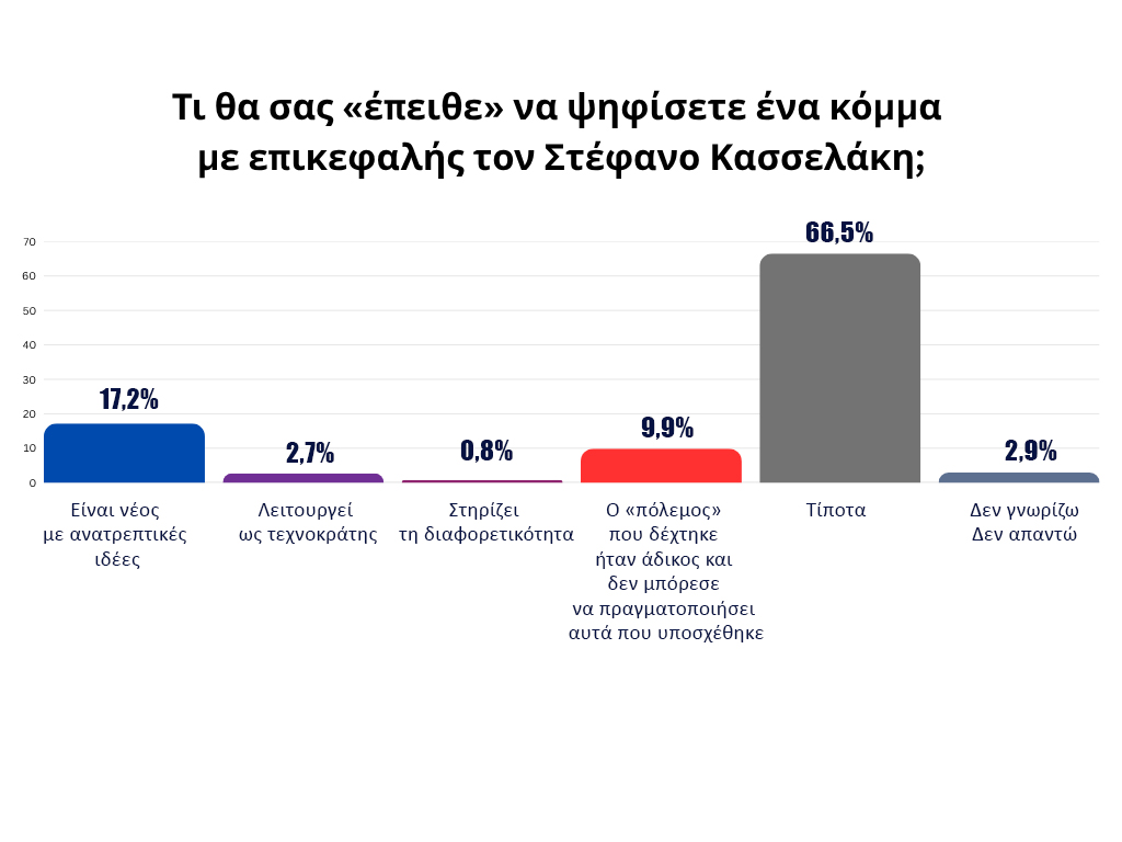 Αντίστοιχο ερώτημα τέθηκε και για τους κ.κ. Τσίπρα και Κασσελάκη, όπου και οι δύο εισέπραξαν ένα μεγαλοπρεπές «Όχι» (63,9% και 81,0%, αντίστοιχα).