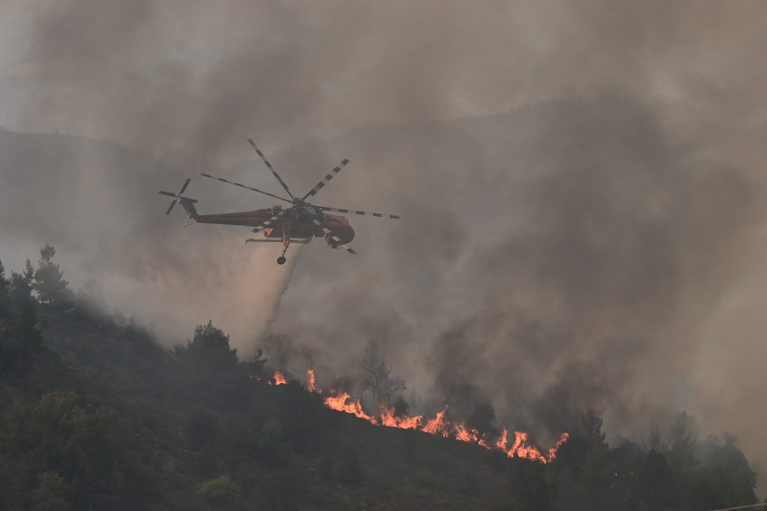 Στην φωτιά στην Παλαιά Πεντέλη επιχειρούν 40 πυροσβέστες με 15 οχήματα και εθελοντές καθώς και δυο αεροσκάφη και ένα ελικόπτερο.